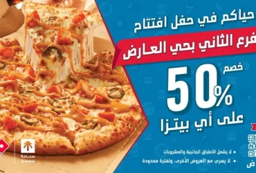 افتتاح فرع دومينوز بيتزا في حي العارض بالرياض مع خصم 50٪ على أي بيتزا