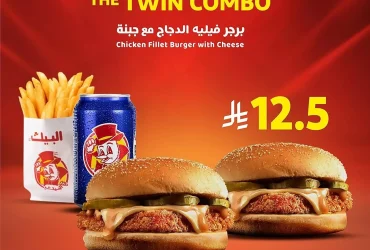 عرض كومبو التوأم من البيك: برجر دجاج مع جبنة ومشروب وبطاطس بسعر 12.5 ريال فقط
