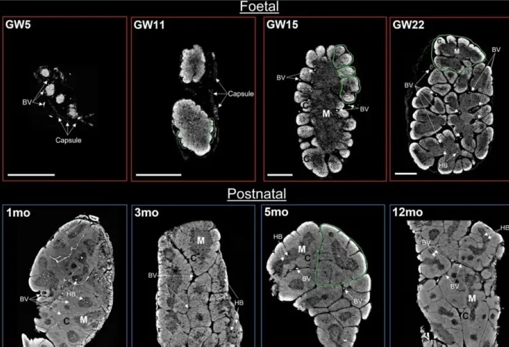وتكشف الصور المعقدة أن الهياكل المعروفة بـ«أجسام هاسال»، التي تتشكل بعد نحو 15 أسبوعا من الحمل، تشغل جزءا كبيرا من نخاع الغدة الزعترية، ما يشير إلى دورها المحتمل في تنظيم البيئة الدقيقة للغدة ووظائف المناعة.