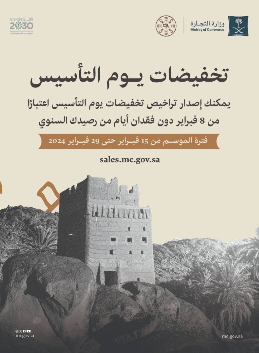 أعلنت وزارة التجارة عن إتاحة التقدم للحصول على تراخيص التخفيضات الموسمية ليوم التأسيس للمنشآت التجارية والمتاجر الإلكترونية اعتبارًا من 8 فبراير 2024، بشكل إلكتروني عبر الرابط ، وتبدأ فترة تخفيضات يوم التأسيس للمستهلكين اعتباراً من 15 فبراير حتى 29 فبراير 2024.