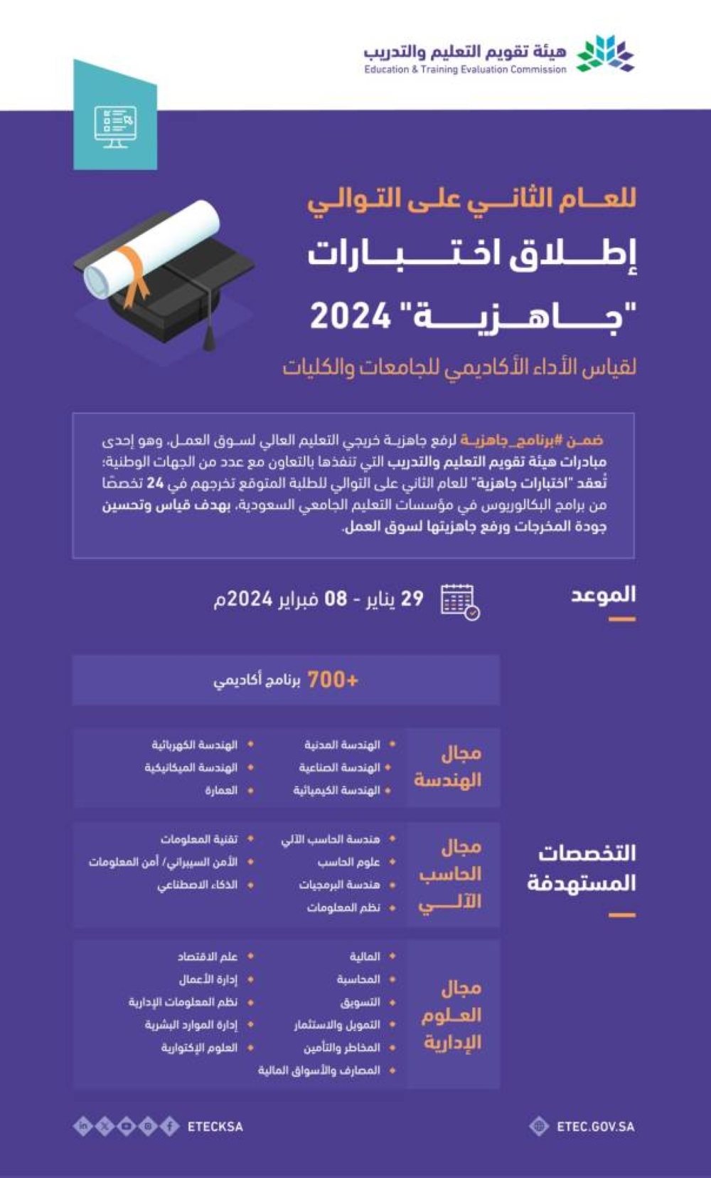 ضمن جهود الهيئة لقياس الأداء الأكاديمي للجامعات والكليات؛ تنطلق الأسبوع القادم اختبارات برنامج جاهزية للعام الدراسي الحالي، وذلك للطلبة المتوقع تخرجهم في الجامعات والكليات السعودية في 24 تخصصًا، بهدف قياس وتحسين جودة مخرجات التعليم الجامعي ورفع جاهزيتها لسوق العمل، وتحقيقًا لمستهدفات برنامج تنمية القدرات البشرية و رؤية السعودية 2030.