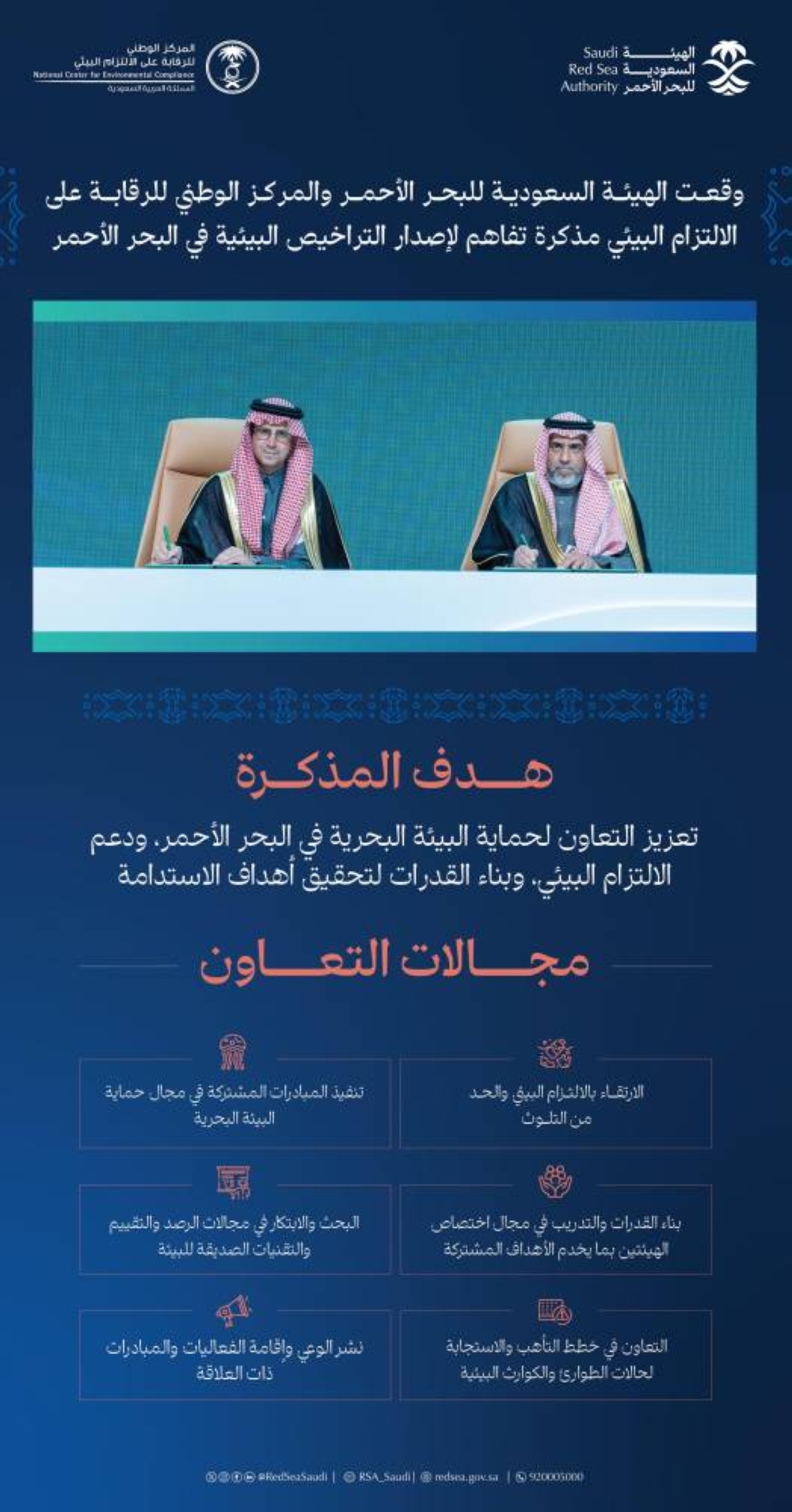 وتهدف مذكرة التفاهم إلى التنسيق والمواءمة بين الهيئة والمركز في إصدار التراخيص والتصاريح البيئية، والتعاون في رفع مستوى الالتزام البيئي، والحد من تلوث الأوساط البيئية داخل النطاق الجغرافي، وتفعيل الربط الإلكتروني، ودعم المبادرات المشتركة في مجال حماية البيئة البحرية في البحر الأحمر.