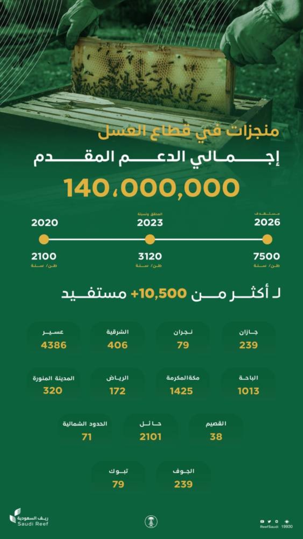 أعلن برنامج التنمية الريفية الزراعية المستدامة “ريف السعودية”، عن وصول إجمالي الدعم المقدّم لقطاع العسل منذ عام 2020م وحتى الآن، إلى (140) مليون ريال، استفاد منها (10,584) مستفيداً في جميع مناطق المملكة الريفية، مبينًا أن مناطق عسير، وحائل، ومكة المكرمة، والباحة؛ هي أكثر المناطق التي استفادت من دعم البرنامج.
