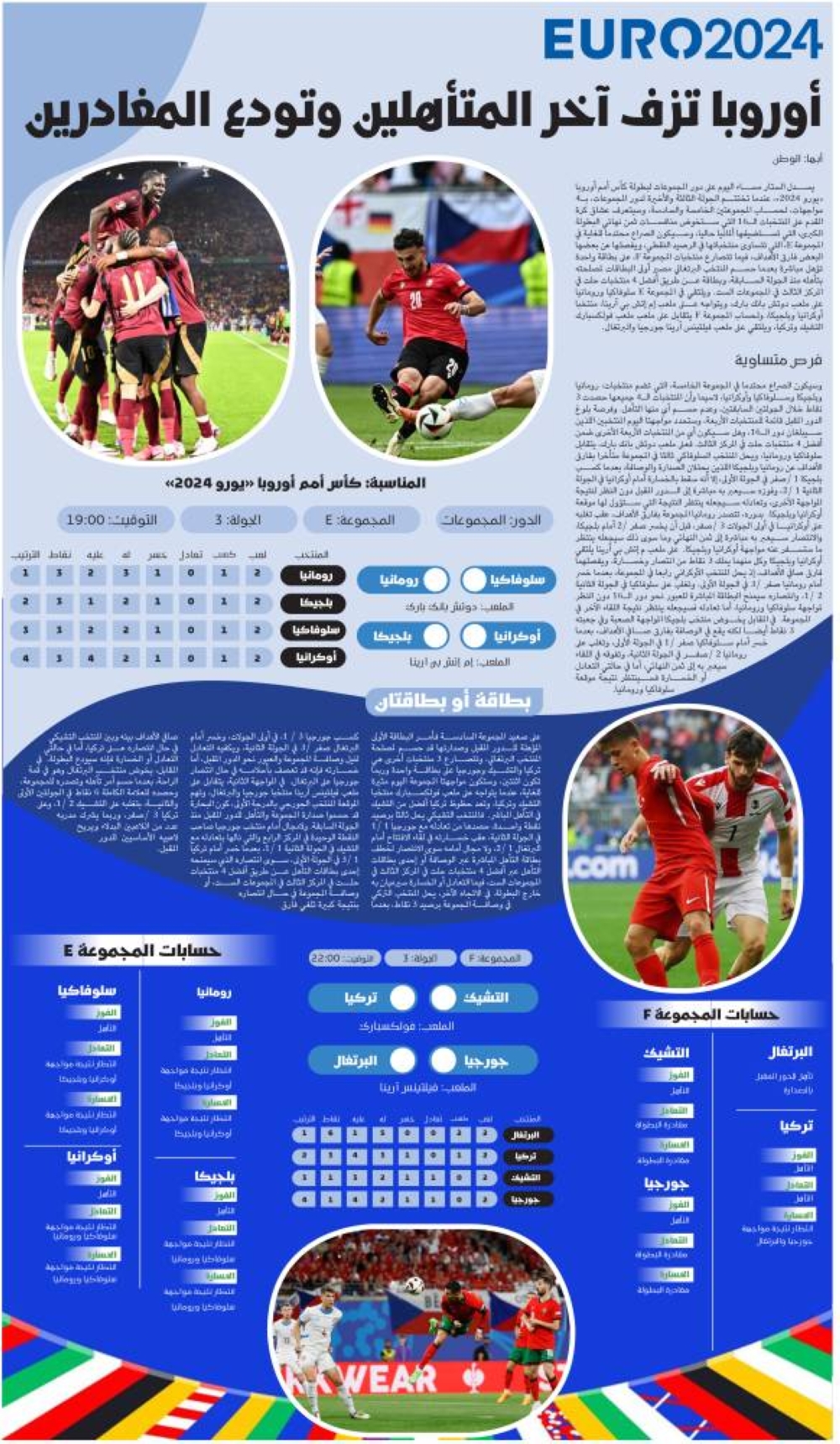 وسيكون الصراع محتدما في المجموعة الخامسة، التي تضم منتخبات: رومانيا وبلجيكا وسلوفاكيا وأوكرانيا، لاسيما وأن المنتخبات الـ4 جميعها حصدت 3 نقاط خلال الجولتين السابقتين، وعدم حسم أي منها التأهل. وفرصة بلوغ الدور المقبل قائمة للمنتخبات الأربعة، وستحدد مواجهتا اليوم المنتخبين اللذين سيبلغان دور الـ16، وهل سيكون أي من المنتخبات الأربعة الأخرى ضمن أفضل 4 منتخبات حلت في المركز الثالث. فعلى ملعب دوتش بانك بارك، يتقابل سلوفاكيا ورومانيا، ويحل المنتخب السلوفاكي ثالثا في المجموعة متأخرا بفارق الأهداف عن رومانيا وبلجيكا اللذين يحتلان الصدارة والوصافة، بعدما كسب بلجيكا 1 /صفر في الجولة الأولى، إلا أنه سقط بالخسارة أمام أوكرانيا في الجولة الثانية 1 /2، وفوزه سيعبر به مباشرة إلى الدور المقبل دون النظر لنتيجة المواجهة الأخرى، وتعادله سيجعله ينتظر النتيجة التي ستؤول لها موقعة أوكرانيا وبلجيكا. بدوره، تتصدر رومانيا المجموعة بفارق الأهداف، عقب تغلبه على أوكرانيا في أولى الجولات 3 /صفر، قبل أن يخسر صفر /2 أمام بلجيكا، والانتصار سيعبر به مباشرة إلى ثمن النهائي وما سوى ذلك سيجعله ينتظر ما ستسفر عنه مواجهة أوكرانيا وبلجيكا. على ملعب م إتش بي آرينا يلتقي أوكرانيا وبلجيكا وكل منهما يملك 3 نقاط من انتصار وخسارة، ويفصلهما فارق صافي الأهداف، إذ يحل المنتخب الأوكراني رابعا في المجموعة، بعدما خسر أمام رومانيا صفر /3 في الجولة الأولى، وتغلب على سلوفاكيا في الجولة الثانية 2 /1، وانتصاره سيمنح البطاقة المباشرة للعبور نحو دور الـ16 دون النظر لمواجهة سلوفاكيا ورومانيا، أما تعادله فسيجعله ينتظر نتيجة اللقاء الآخر في المجموعة. في المقابل يخوض منتخب بلجيكا المواجهة الصعبة وفي جعبته 3 نقاط أيضا لكنه يقع في الوصافة بفارق صافي الأهداف، بعدما خسر أمام سلوفاكيا صفر /1 في الجولة الأولى، وتغلب على رومانيا 2 /صفر في الجولة الثانية، وتفوقه في اللقاء سيعبر به إلى ثمن النهائي، أما في حالتي التعادل أو الخسارة فسينتظر نتيجة موقعة