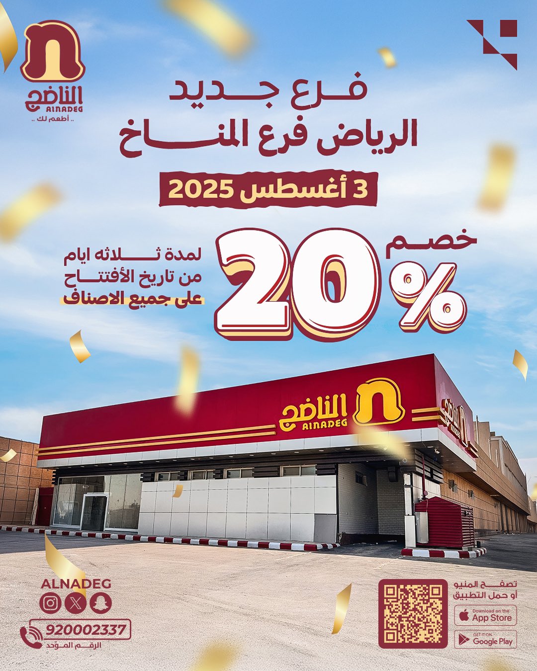 يستعد مطعم الناضج لإطلاق فرعه الجديد في الرياض وصوف يكون افتتاح الفرع الجديد في حي المناخ يوم الأحد 3 أغسطس 2025 لا تفوتوا افضل العروض الحصرية و المميزه ضمن فرعه الجديد مطعم الناضج يعتبر من افضل المطاعم السعودية.