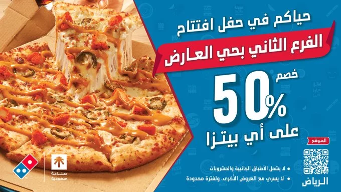 بمناسبة افتتاح الفرع الثاني في حي العارض، تقدم دومينوز عرضًا مغريًا لا يُفوت: