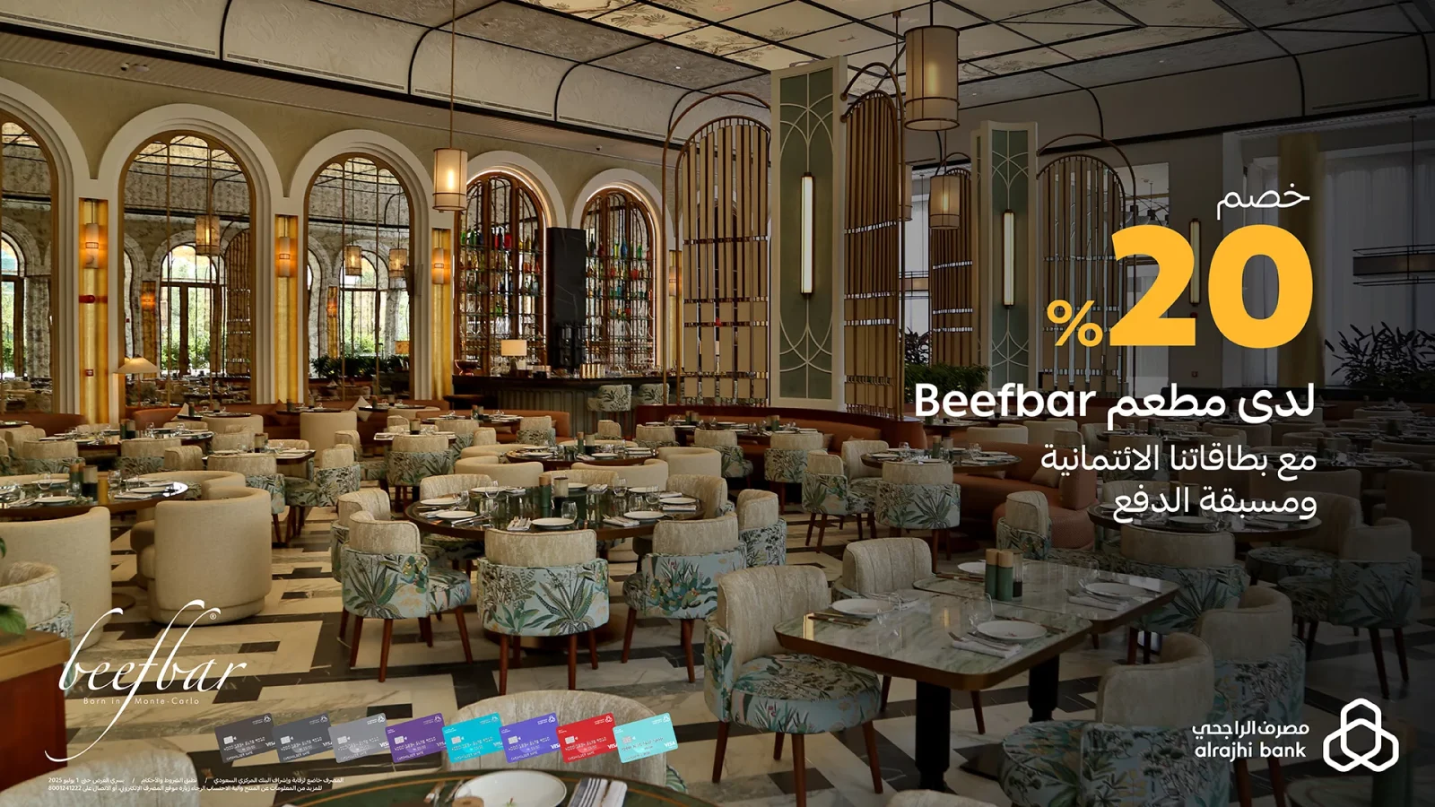 ومن أبرز هذه العروض الحالية، خصم مطعم Beefbar Monte-Carlo في السعودية، والذي يأتي ضمن عروض مصرف الراجحي الحصرية لعملائه. العرض ساري خلال شهر مايو 2025، ويوفر خصمًا مغريًا بنسبة 20% عند استخدام بطاقات الراجحي الائتمانية أو مسبقة الدفع