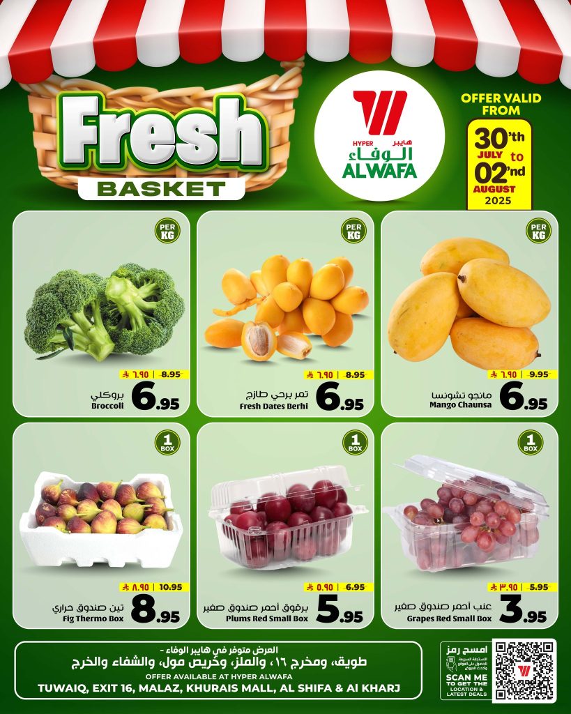 عروض الوفاء هايبر ماركت حتي السبت 2 اغسطس 2025 تقدم لك باقة مميزة من الخضروات والفواكه الطازجة من البروكلي والتمر البرحي الطازج والمانجو الشونسا بأفضل جودة بالإضافة إلى التين الطازج في صناديق حرارية والعنب الأحمر والبرقوق الأحمر و تشمل ايضا الفطر الأبيض الكامل وشرائح الفطر البني والأبيض و الفواكه الطازجة