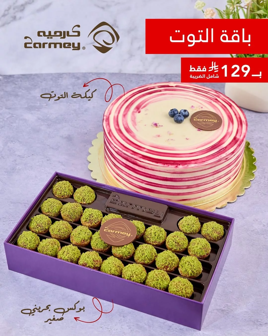 يقدم كارمية عرضا فاخرا على كيك التوت و الحلويات الشهية لديه ضمن عروض الاستقبال و الضيافة التي سوف تسعد الضيوف و الاقرباء و الاحتفالات بأفخر انواع الحلويات الشهية و الكيك من كارمية بسعر فقط 129 ريال لا تفوتوا افضل العروض من كارمية