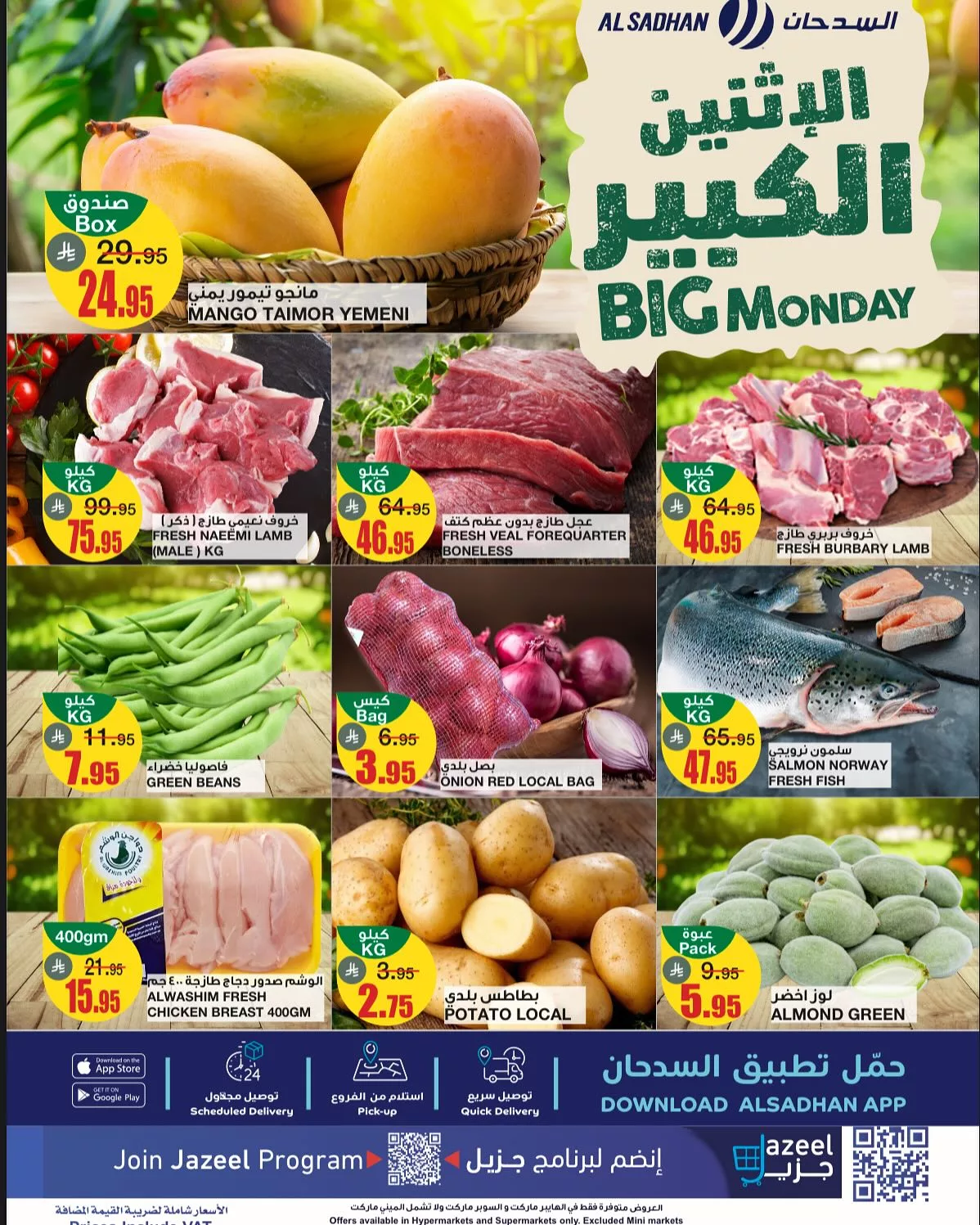 عروض السدحان الاثنين 5 مايو 2025 تقدم باقة متنوعة من المنتجات الطازجة والمختارة بعناية لتلبية احتياجات الأسرة السعودية بداية من اللحوم الطازجة بأنواعها مثل لحم النعيمي والعجل والبربري وحتى الأسماك النرويجية الفاخرة والدواجن عالية الجودة كما تضم العروض خضروات وفواكه محلية ومستوردة