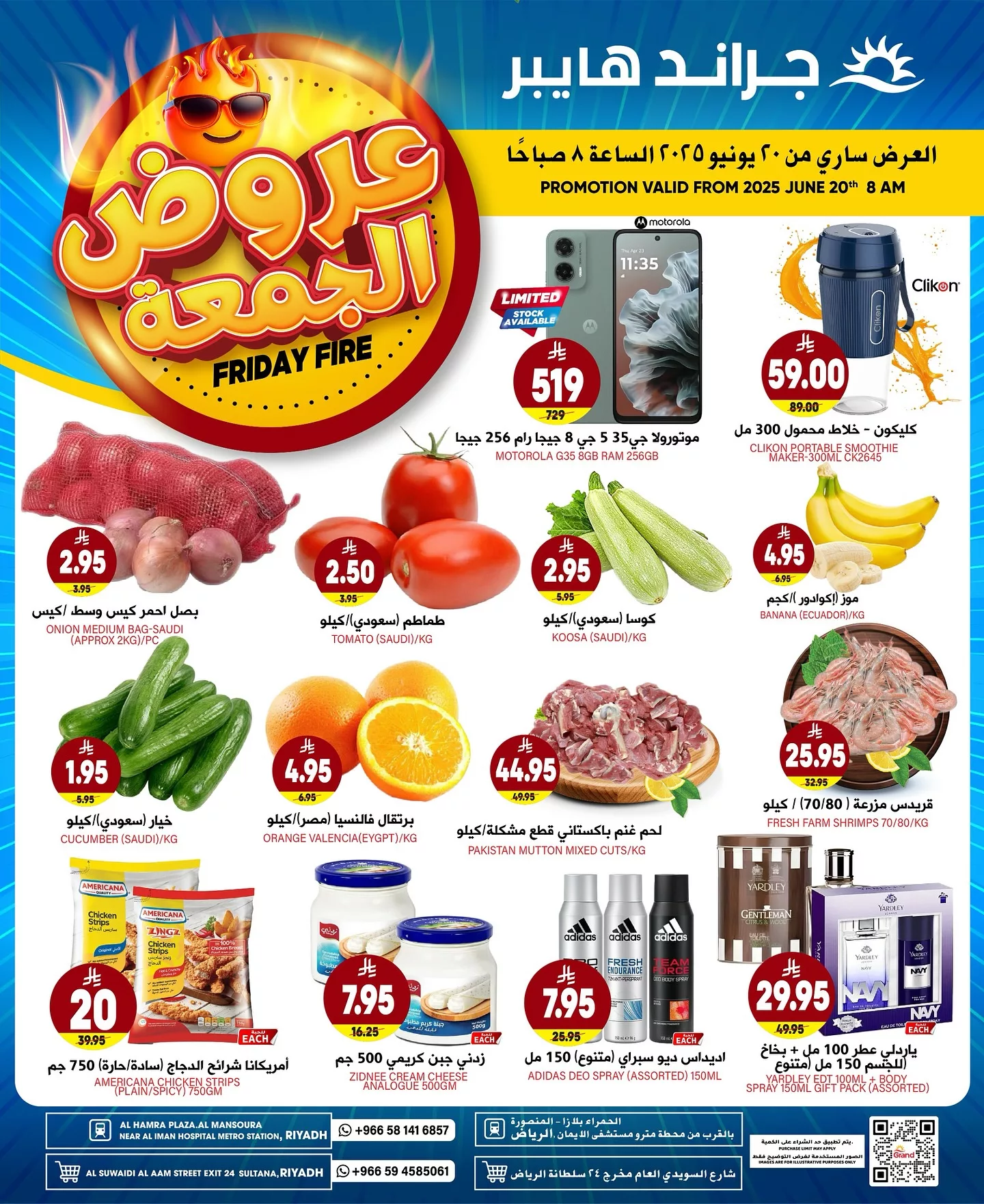عروض جراند هايبر الرياض الجمعة 20 يونيو 2025 تقدم تشكيلة واسعة من المنتجات الطازجة التي تشمل الخضار والفاكهة مثل الطماطم والخيار والكوسا والبرتقال والموز وغيرها حيث تأتي هذه العروض لتلبية احتياجات العائلات اليومية بأفضل جودة وأقل الأسعار وتشجع المتسوقين على شراء كميات مناسبة من السلع الأساسية