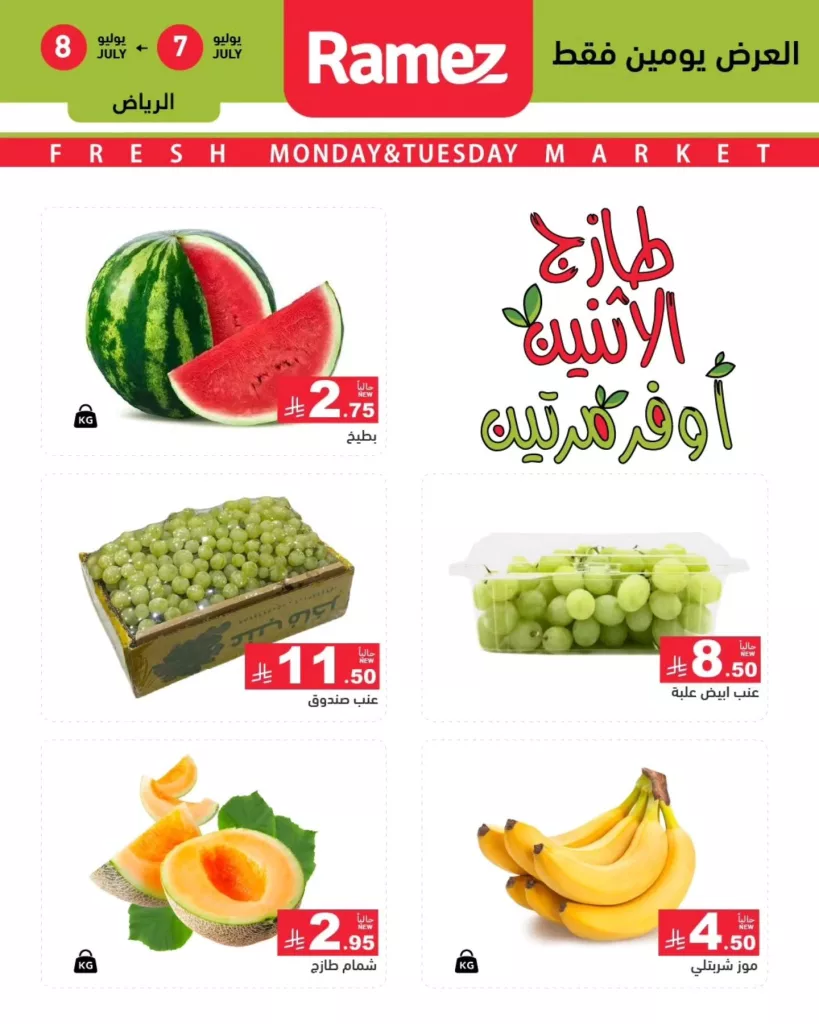 تواصل أسواق رامز السعودية تقديم أقوى عروض الخضار والفواكه الطازجة لعشاق التوفير والجودة، مع حملة “طازج الاثنين أوفر مرتين” والتي تعود من جديد بأصناف مختارة وأسعار لا تفوّت، وتحديدًا في فرعي حفر الباطن والرياض يومي الاثنين والثلاثاء الموافق 7 و8 يوليو 2025. هذه العروض لا تُفوت لمحبي الفريش، خاصة لمحبي المذاق الطازج والأسعار المخفضة التي ترضي جميع الأذواق