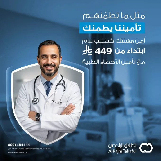 مثل ما تطمن مرضاك، تأميننا يطمنك – بهذه العبارة يفتتح تكافل الراجحي عرضه الجديد للأطباء العامين، حيث يتيح لهم فرصة الاستفادة من برنامج تأميني شامل ضد الأخطاء الطبية التي قد تحدث أثناء ممارسة المهنة
