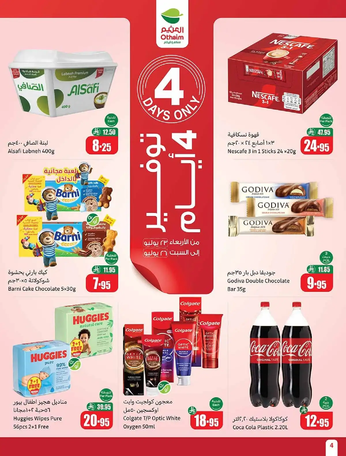 عروض العثيم الخاصة الاربعاء 23-7-2025 لفترة محدودة علي منتجات متنوعة من لبنة صافي و قهوة نسكافيه و افضل المشروبات الغازية من كوكاكولا و غيرها من المنتجات و باقل الاسعار التي تناسب جميع الفئات و ذلك لمدة 4 ايام فقط في فروع اسواق العثيم تابعونا علي موقعكم عروض توداي ليصل كل جديد عن عروض السعودية .