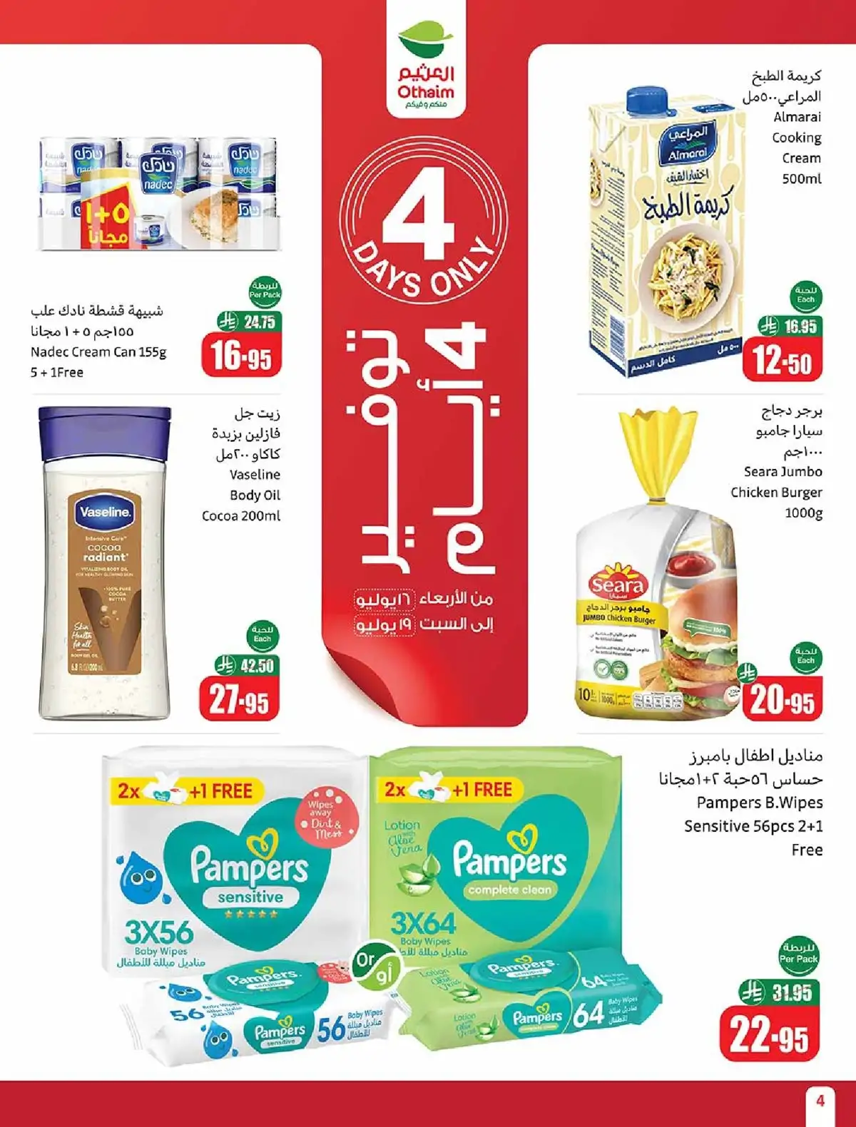 عروض العثيم الأربعاء 16 يوليو 2025 تقدم مجموعة مختارة من المنتجات اليومية التي تلبي احتياجات الأسرة بأسعار منافسة حيث تشمل العرض عبوات قشطة نادك التي تأتي بتغليف عملي وكفاءة عالية للطهي والحلويات بالإضافة إلى كريم الطبخ من المراعي والذي يعتبر خياراً مثالياً لإعداد أشهى الأطباق