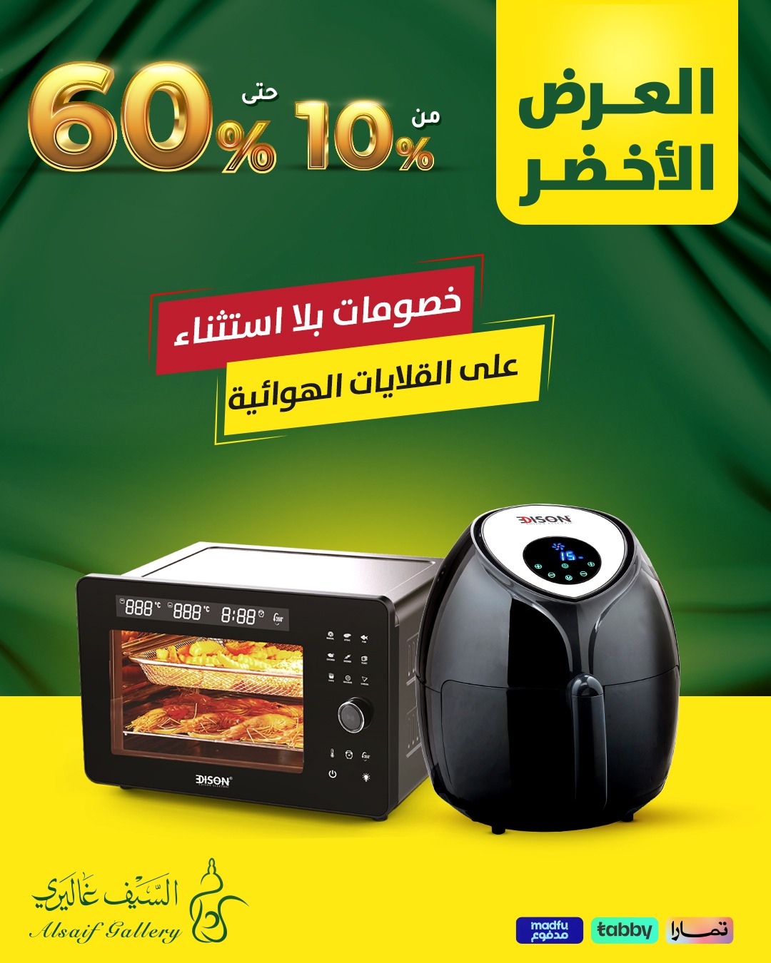 العرض الأخضر من السيف غاليري يقدم لك مجموعة مميزة من الأجهزة المنزلية العصرية التي تجمع بين الجودة العالية والتصميم العملي مثل ثلاجة الرحلات المدمجة وخبازة إيديسون الذكية بخاصية التحكم في الحرارة و يشمل أيضا تشكيلة أنيقة من الترامس العملية التي تتميز بحفظ الحرارة لفترات طويلة بتصميمات أنيقة تناسب ذوقك