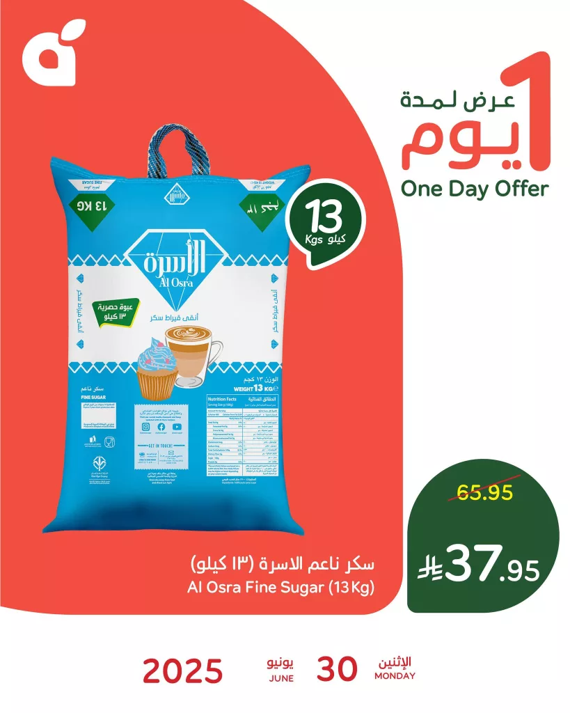 - سكر ناعم الأسرة (13 كجم) – 37.95 ريال بدلًا من 65.95 ريال