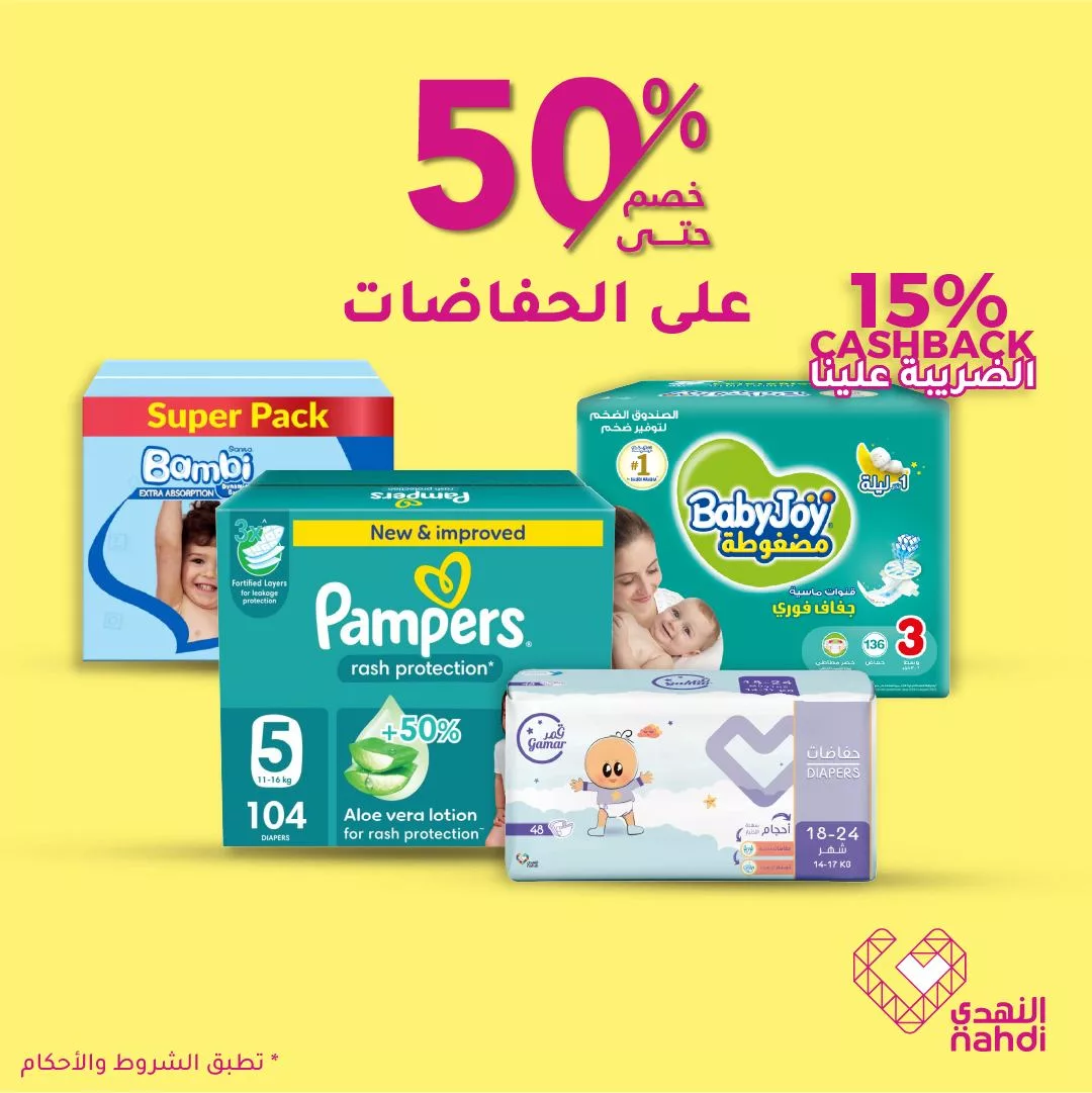 - الخصومات تصل إلى ٥٠٪ على الحفاضات المختارة