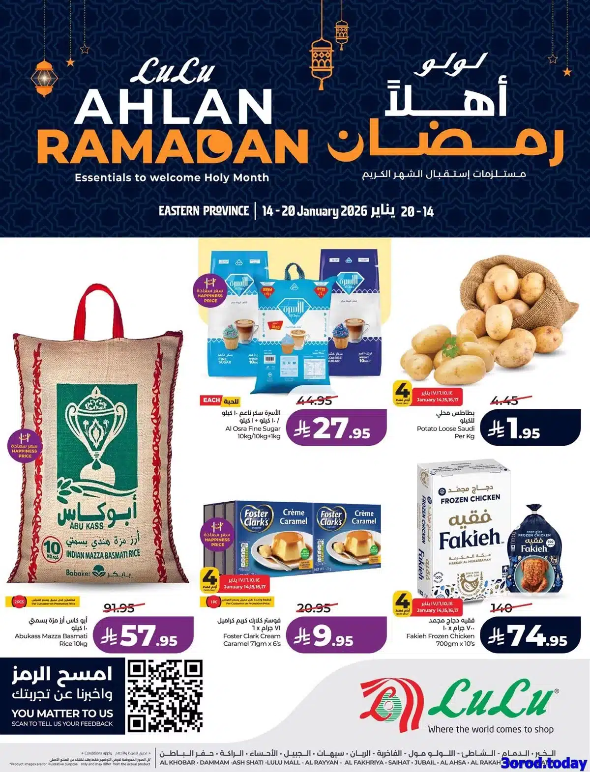 عروض لولو المنطقة الشرقية الأربعاء 14-1-2026 الموافق 25 رجب 1447هـ و تحتوي على بيض المائدة وزيت الذرة وأكياس الأرز المصري وحلاوة طحينية ومعلبات التونة والذرة الحلوة وحليب مبخر ولبنة و بتشمل أيضا أجهزة منزلية متميزة منها فرن كهربائي كبير ومحمصة خبز عريضة وشواية فحم وسخان مياه فوري ومكواة كبس وموزع مياه