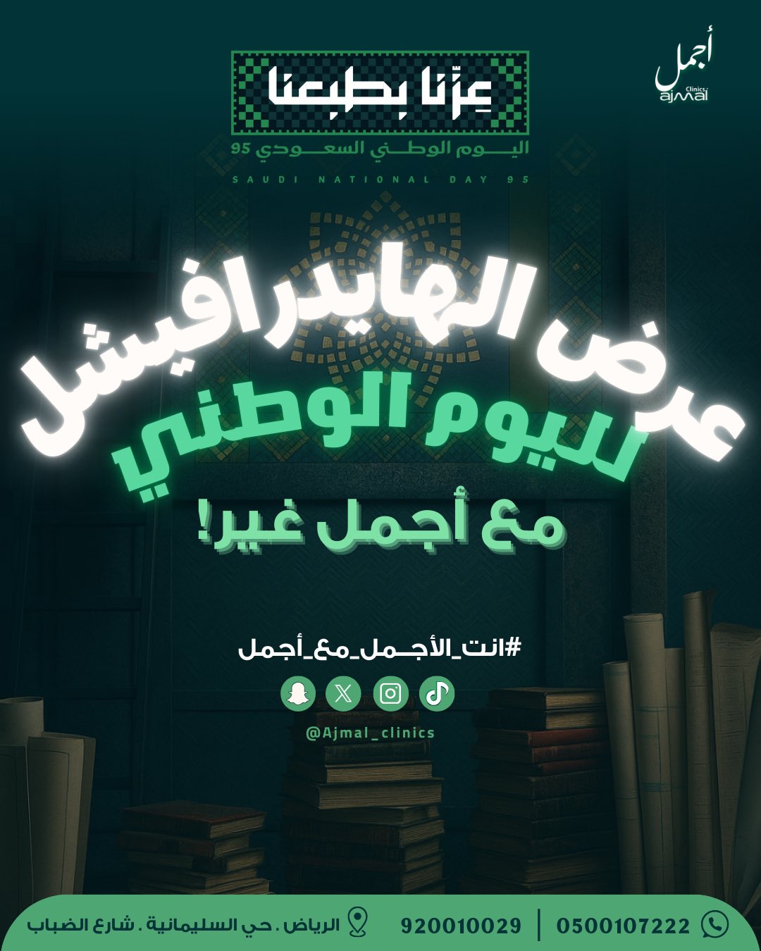 عرض الهايدرافيشل من عيادات أجمل ليمنح السيدات والرجال تجربة استثنائية للعناية بالبشرة، حيث يجمع بين التنظيف العميق والترطيب والتغذية لإعادة الحيوية والنضارة للبشرة. العرض مصمم ليكون خيارًا مثاليًا لمن يبحث عن لمسة جمالية بمناسبة اليوم الوطني، مع أسعار منافسة وخدمة عالية الجودة