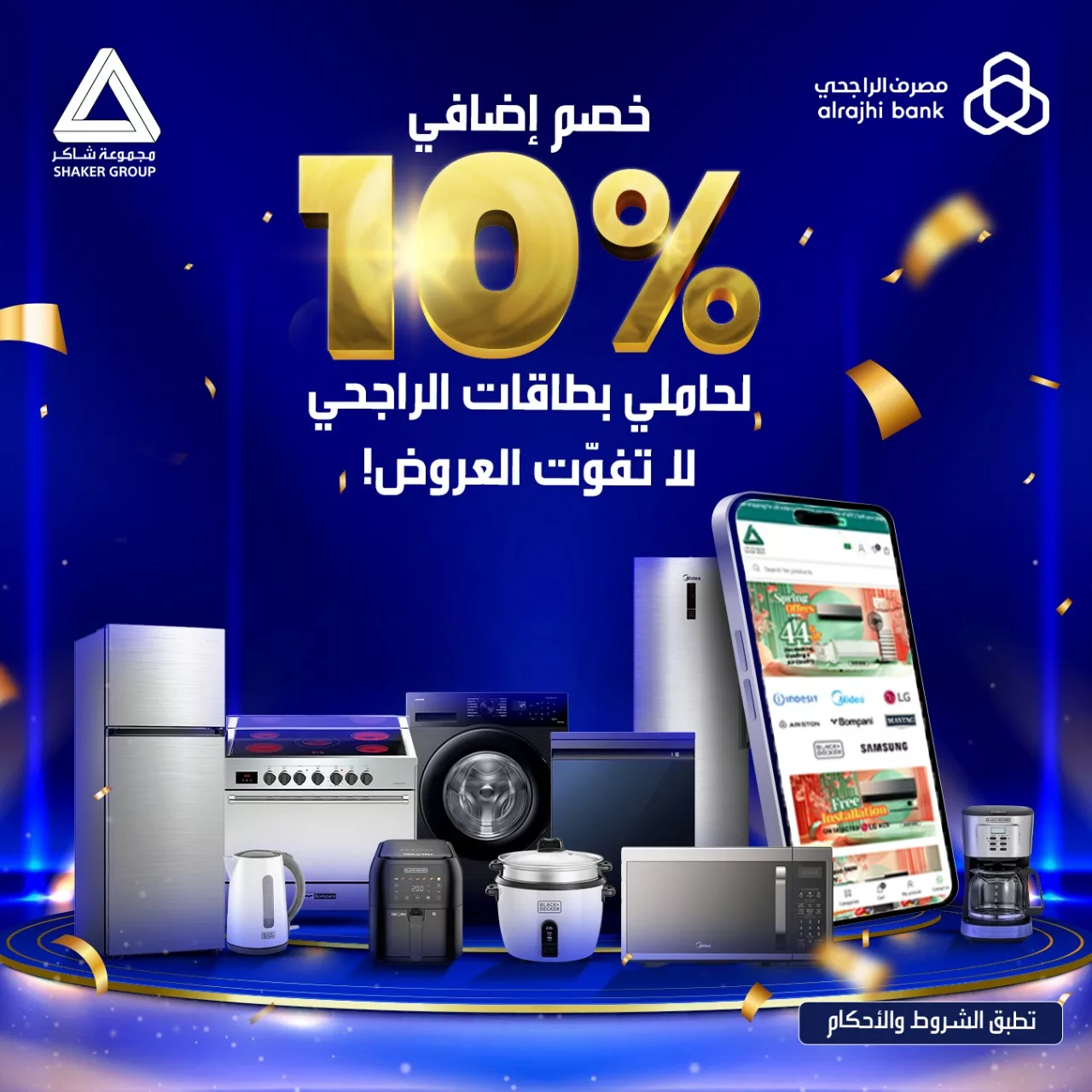 ومن بين هذه العروض الرائعة، أطلقت مجموعة شاكر بالتعاون مع مصرف الراجحي عرضًا مميزًا ضمن حملة “زيّن بيتك”، حيث يحصل العملاء على خصم إضافي بنسبة 10٪ عند استخدام بطاقات الراجحي للدفع، وذلك سواء داخل معارض شاكر أو عبر الموقع الإلكتروني
