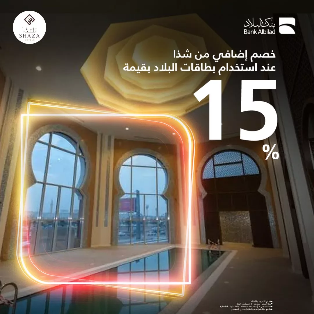استمتع بخصم فندقي فاخر بنسبة 15٪ في سلسلة فنادق شذا عند الحجز والدفع باستخدام بطاقات بنك البلاد