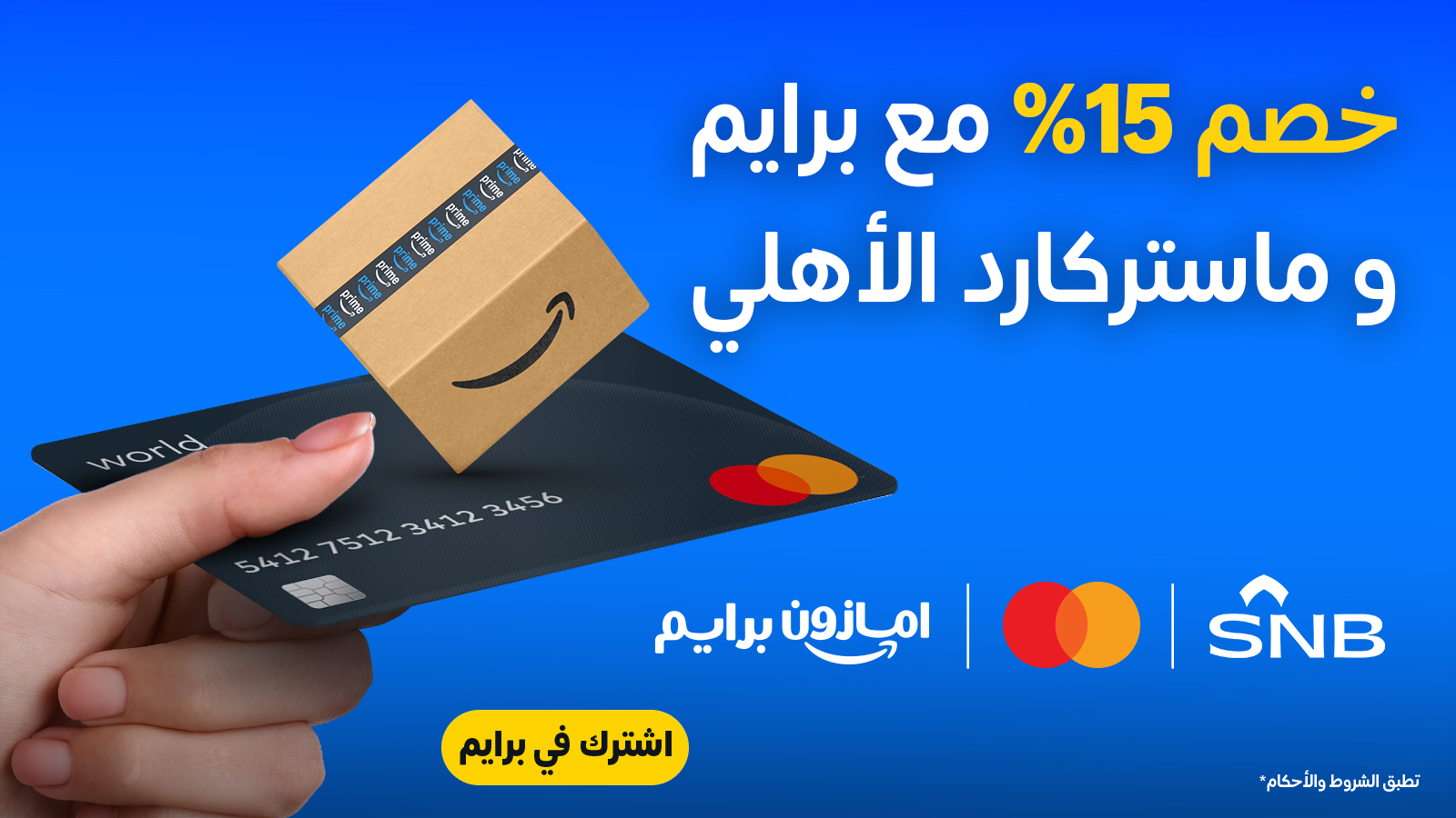 • استمتع بخصم يصل إلى 15% عند الاشتراك في أمازون برايم باستخدام بطاقات ماستركارد الأهلي.