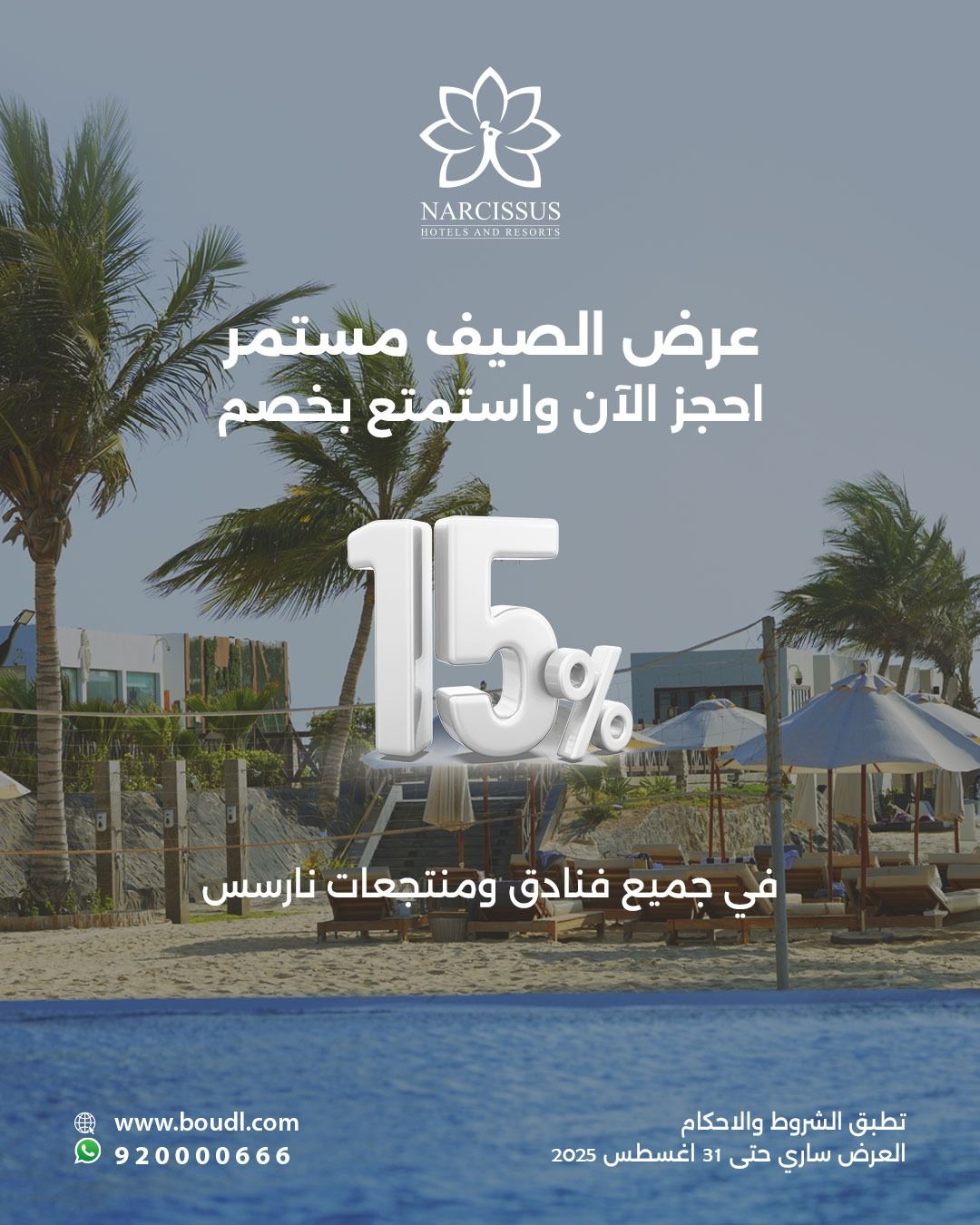 عرض الصيف من فنادق ومنتجعات نارسس 2025، أصبح بإمكان الزوار الاستمتاع بتجربة استثنائية مع خصومات حصرية تعزز من متعة الإقامة وتمنح فرصة مثالية لقضاء إجازة لا تنسى هذا العرض لغاية 31 اغسطس لا تفوتوا العرض
