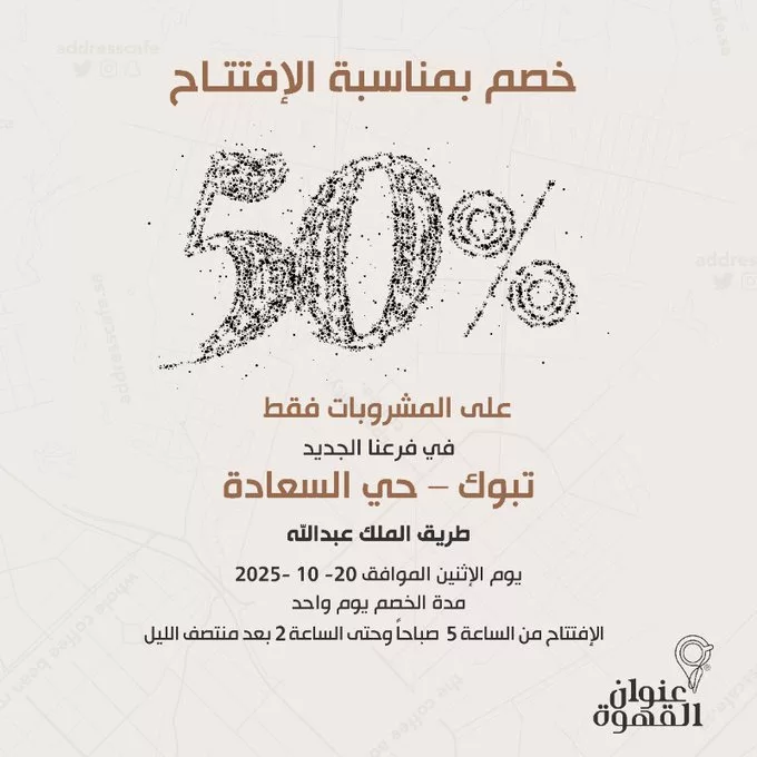 احصل خصم 50% على المشروبات فقط من عنوان القهوه بمناسبة افتتاح فرع تبوك- حي السعادة طريق الملك عبدالله لا تفوتوا العرض يوم الاثنين 20 اكتوبر 2025