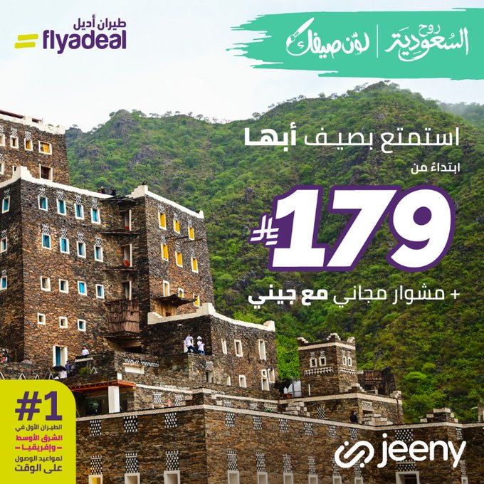 عرض طيران أديل في صيف 2025 رحلاته إلى مدينة أبها الساحرة بأسعار تنافسية تبدأ من 179 ريال سعودي فقط. ويأتي هذا العرض المميز بالتعاون مع تطبيق جيني الذي يمنح المسافرين رحلة مميزه تجعل التجربة أكثر راحة وسلاسة
