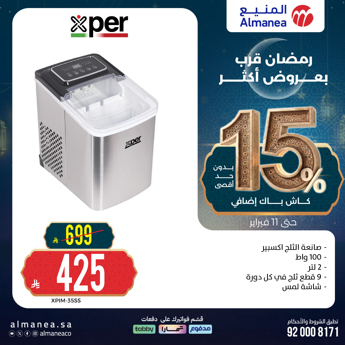 كما تضم عروض المنيع في تخفيضات رمضان برادات مياه من هيتاشي وبلاتينيوم وهام مع ميزة الكاش باك الإضافي 15% تابعونا لمعرفة كل جديد عن عروض رمضان 2026 في السعودية علي موقع عروض توداي .