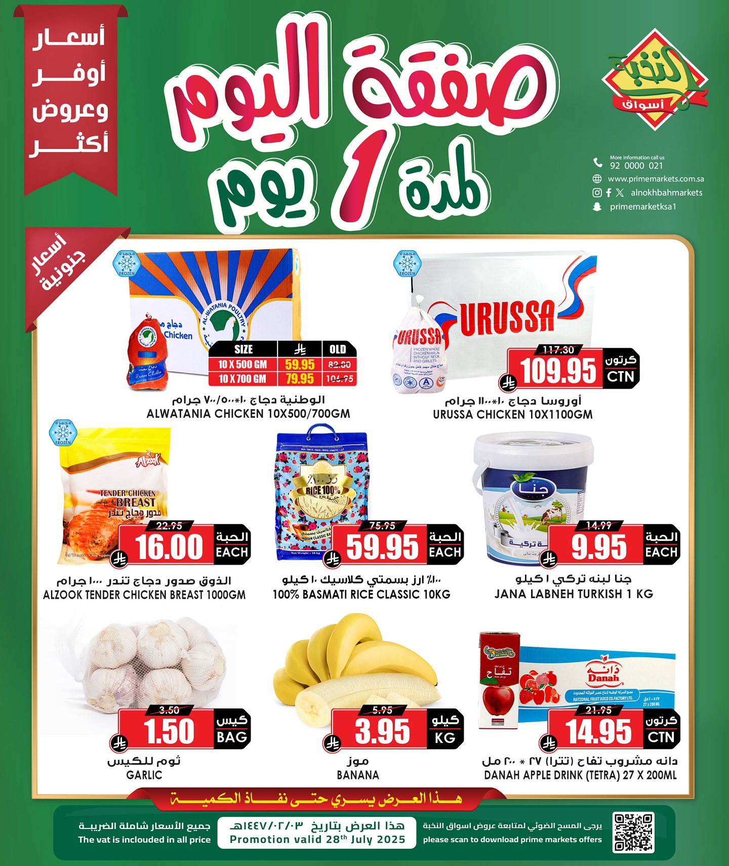 صفقة اليوم من أسواق النخبة تقدم لك تشكيلة مميزة من المنتجات الطازجة والمجمدة لتلبية احتياجات الأسرة اليومية تشمل العرض دجاج الوطني المجمّد بجودة عالية وأرز بسمتي كلاسيك ١٠ كيلو و تشمل أيضا منتجات أساسية من جنا بطعم كريمي مميز ومشروب تفاح دانه المفضل لدى الكبار والصغار مع وجود فواكه طازجة مثل الموز
