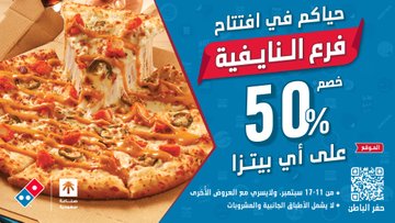 - خصم 50% على أي بيتزا من دومينوز بيتزا في فرع حي النايفية فقط.