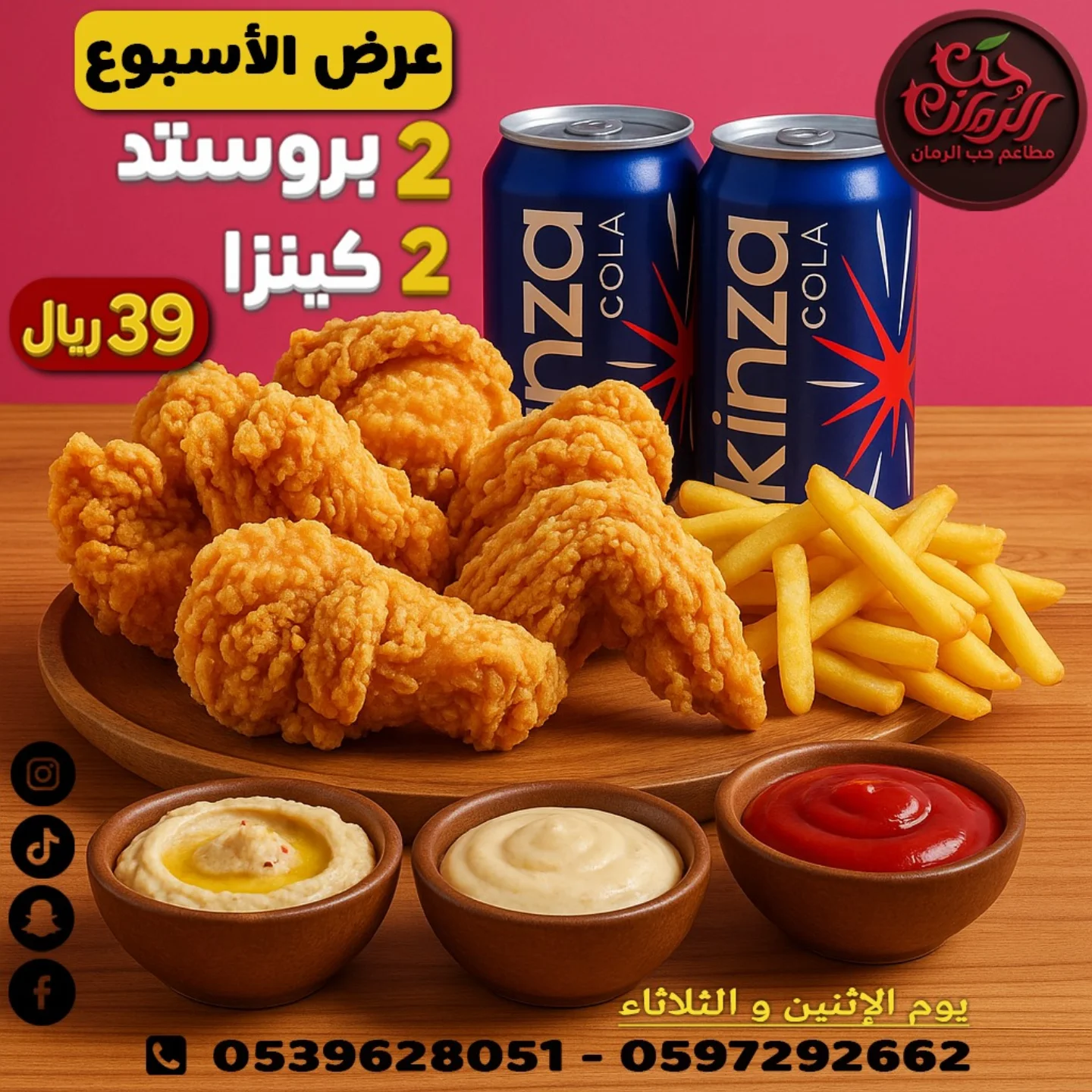 عرض الأسبوع من مطاعم حب الرمان: 2 بروستد + 2 كينزا فقط بـ 39 ريال أيام الاثنين والثلاثاء