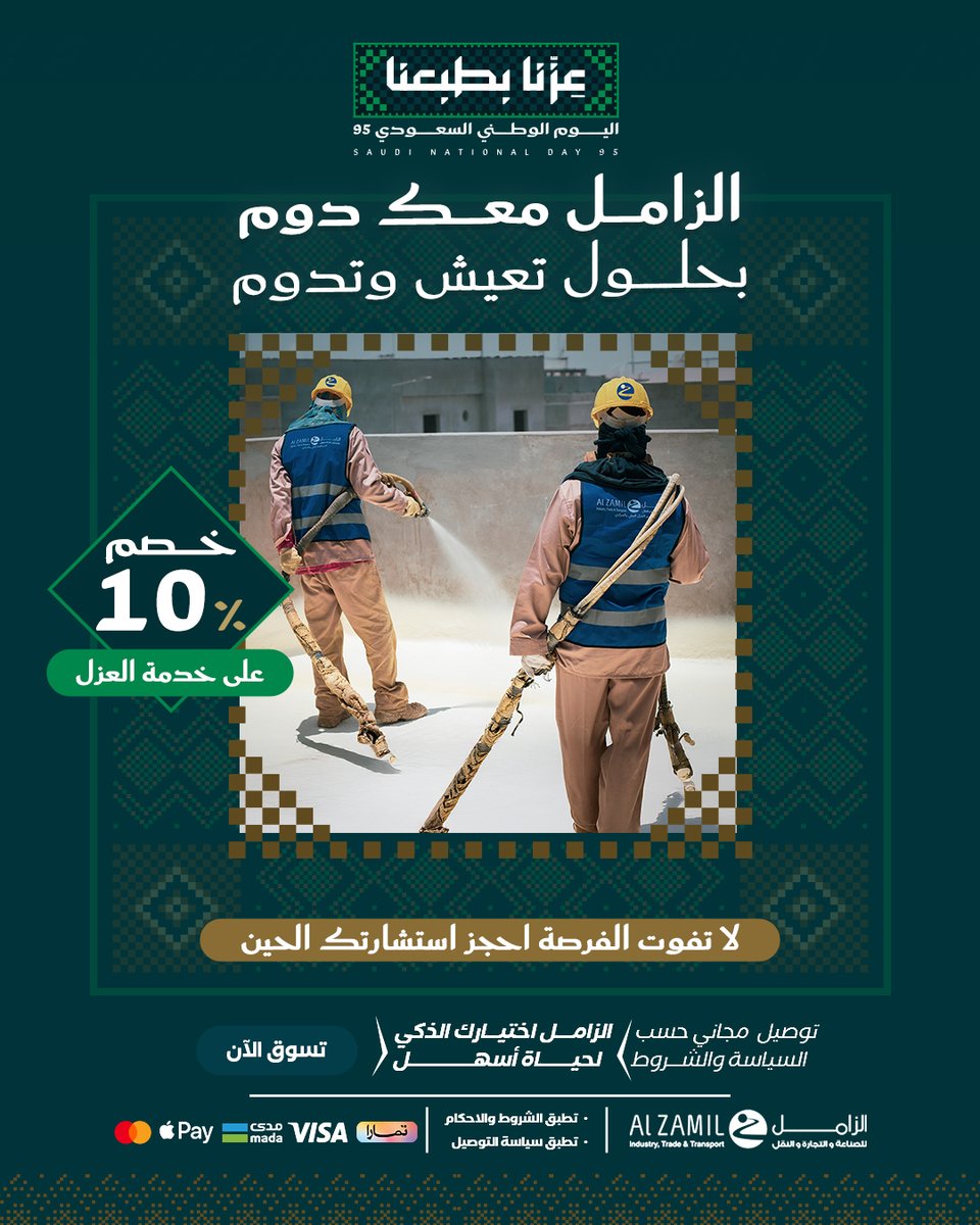 الزامل للصناعة والتجارة والنقل تقدم عرض مميز بمناسبة اليوم الوطني السعودي 95 على خدمة العزل مع خصم يصل إلى 10٪ حماية الجدران والأسطح من التأثيرات الخارجية والعديد من الخدمات الاخرى في شركة الزامل لا تفوتوا افضل العروض الخاصة في اليوم الوطني