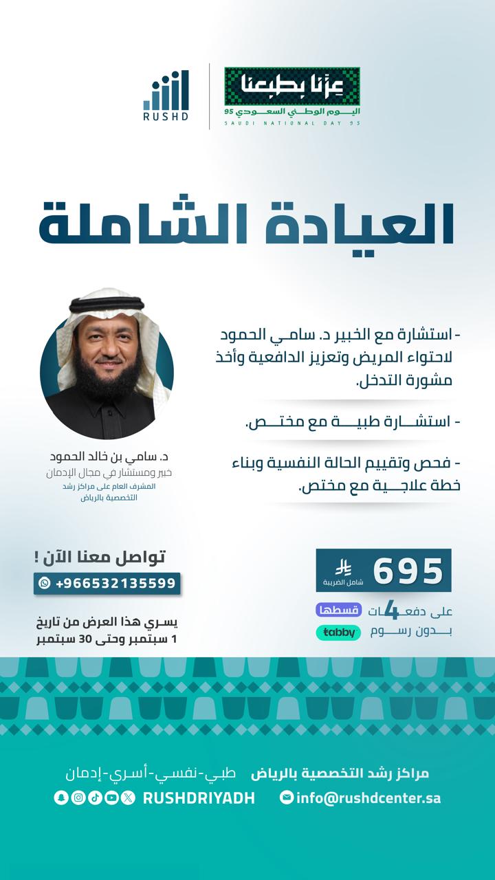 بمناسبة اليوم الوطني السعودي 95 تقدم مراكز رشد التخصصية بالرياض عرض مميز على العيادة الشاملة، ليمنح الجميع فرصة الحصول على استشارة طبية متكاملة بأسعار مخفضة وبتجربة علاجية احترافية هذا العرض الذي يستمر طوال شهر سبتمبر