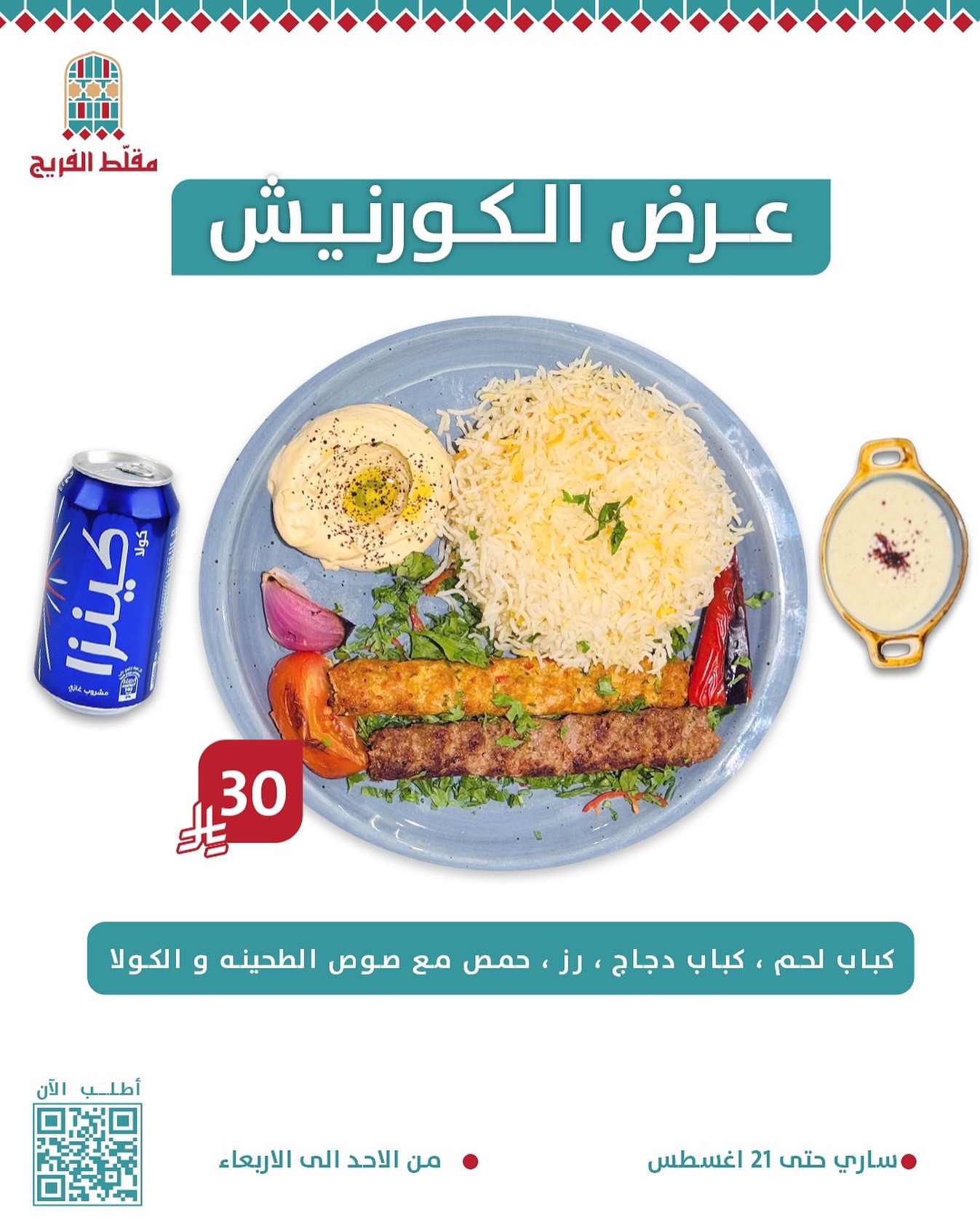 يقدم مطعم مقلط الفريج عرض الكورنيش المميز بسعر مغري وتجربة طعام متكاملة تلبي مختلف الأذواق العرض ساري حتى 21 أغسطس ليمنحك فرصة مثالية للاستمتاع بوجبة متكاملة في أجواء مميزة على الكورنيش