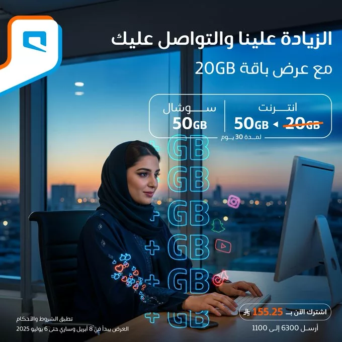 للاشتراك في عرض باقة 20GB المطور، يمكن إرسال الرمز 6300 إلى الرقم 1100 لتفعيل الباقة فورًا والاستفادة من كامل المميزات المعروضة