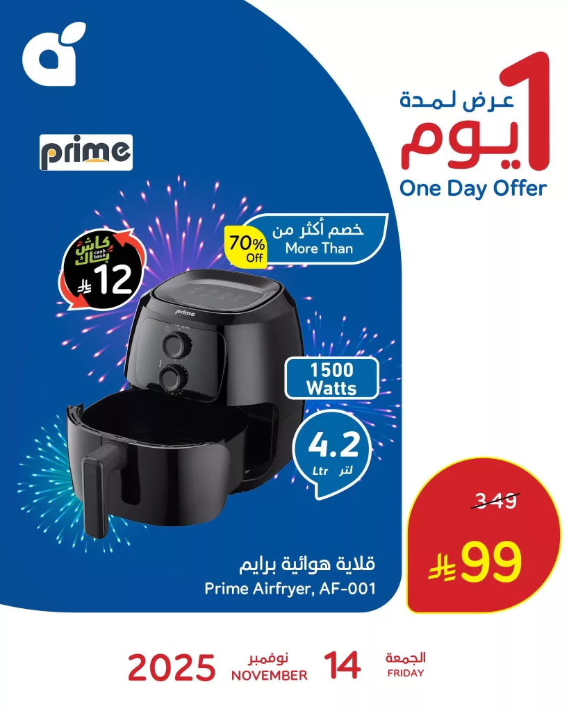 نقدم لكم اليوم احدث عروض بنده بتاريخ الجمعة 14 نوفمبر 2025 و بتحتوي علي افضل الاجهزة المنزلية و الاساسية في كل منزل منزل و هي قلاية برايم الهوائية في عروض كليكس تمتع بخصومات تصل الي 70% في عرض حصري متاح اليوم فقط تابعونا لمعرفة كل جديد عن عروض السعودية علي موقعكم عروض توداي .