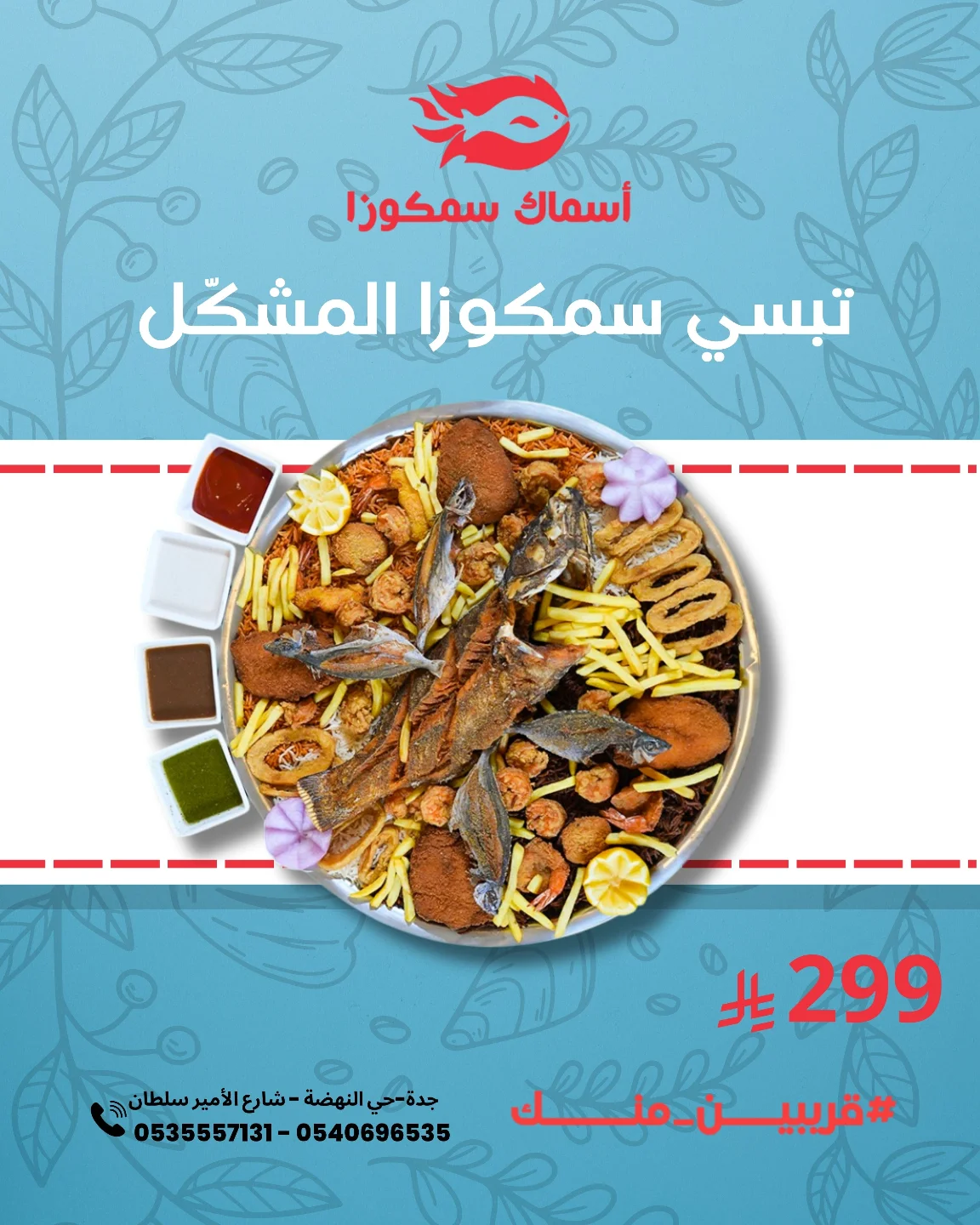 عرض مطعم أسماك سمكوزا في حي النهضة بجدة المميز فيه اشهى المأكولات البحرية بأسعار منافسة فقط بـ 299 ريال طبق تبسي سمكوزا المشكل لا تفوتوا افضل المأكولات الشهية في مطعم اسماك سمكوزا السعودية في حي النهضة جدة