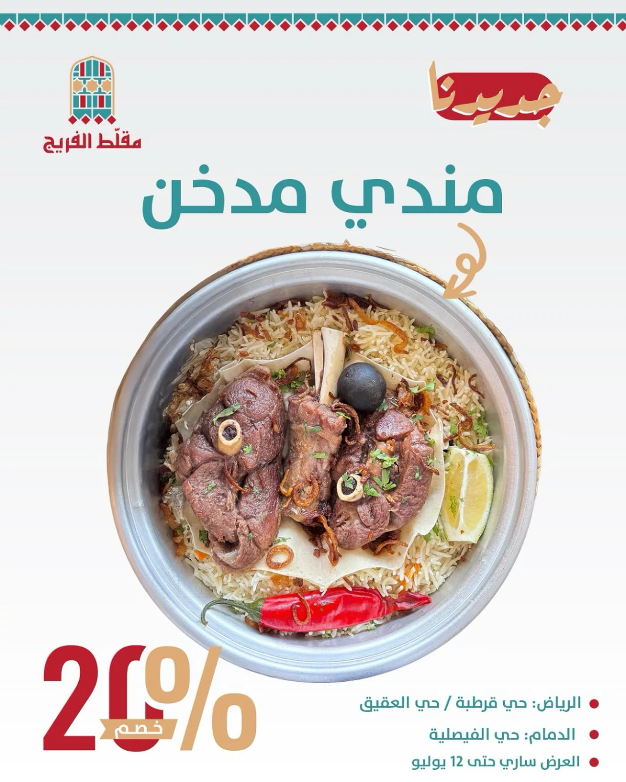 عروض المطاعم في السعودية لا تتوقف عن إدهاشنا بكل جديد ومميز، ومن أبرز العروض الحالية التي تستحق التجربة هو عرض مطعم “مقلط الفريج” على طبق المندي المدخن الجديد، حيث يجمع هذا العرض بين النكهة الأصيلة والخصم الجذاب بنسبة 20% ليستمتع عشاق المأكولات السعودية الأصيلة بتجربة فريدة ومميزة من أطباق المندي الفاخرة