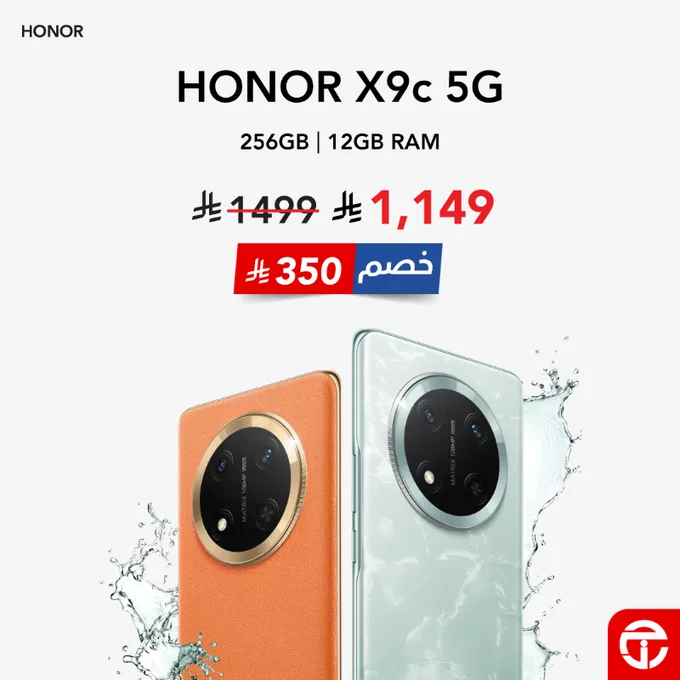 احصل الأن على هاتف HONOR X9c 5G بسعة تخزين 256 جيجابايت وذاكرة وصول عشوائي RAM بسعة 12 جيجابايت بسعر 1,149 ريال سعودي فقط بدلًا من السعر السابق 1,499 ريال سعودي، مما يعني خصم مباشر بقيمة 350 ريال سعودي