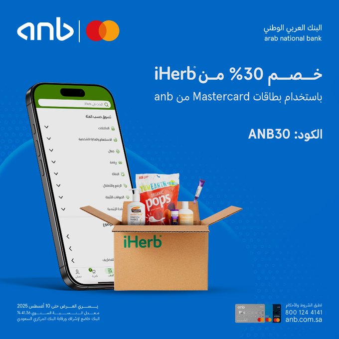 عرض خصم 30% من iHerb باستخدام بطاقات Mastercard من البنك العربي الوطني (ANB)