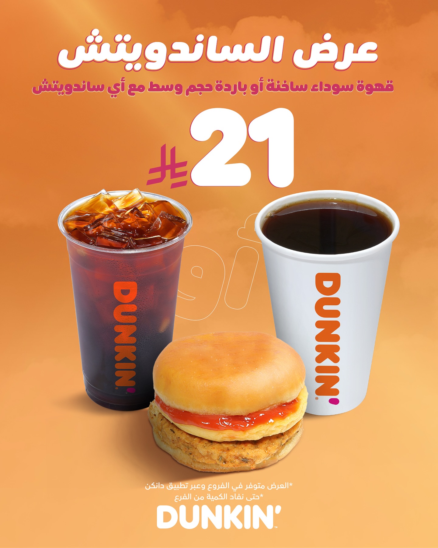 عرض الساندويتش من دانكن الذي يجمع بين القهوة الشهية سواء الساخنة أو الباردة مع ساندويتش مميز بسعر مغري هذا العرض الذي خاص لمحبي القهوة والسندويتشات الذين يفضلون الاستمتاع بوجبة خفيفة متكاملة بسعر 21 ريال فقط لا تفوتوا العروض