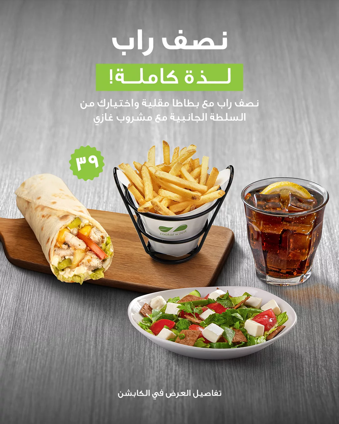 عروض المطاعم في السعودية دائمًا تحمل الكثير من المفاجآت لعشاق المذاق اللذيذ والتجارب المميزة، ومن أبرز هذه العروض حاليًا عرض “نصف راب.. لذّة كاملة!” من زعتر وزيت السعودية، والذي يمتد خلال أيام الأسبوع من الأحد إلى الخميس من الساعة 12 ظهرًا حتى 5 مساءً داخل الفروع فقط