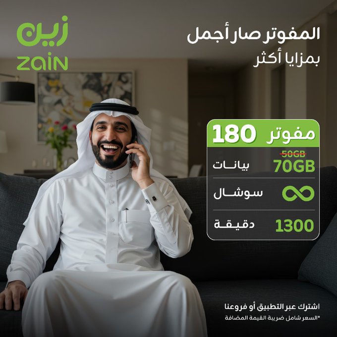 باقة المفوتر 180: بيانات: 50GB.بيانات تجوال: 70GB و سوشيال: غير محدود و دقائق تجوال: 1300 دقيقة