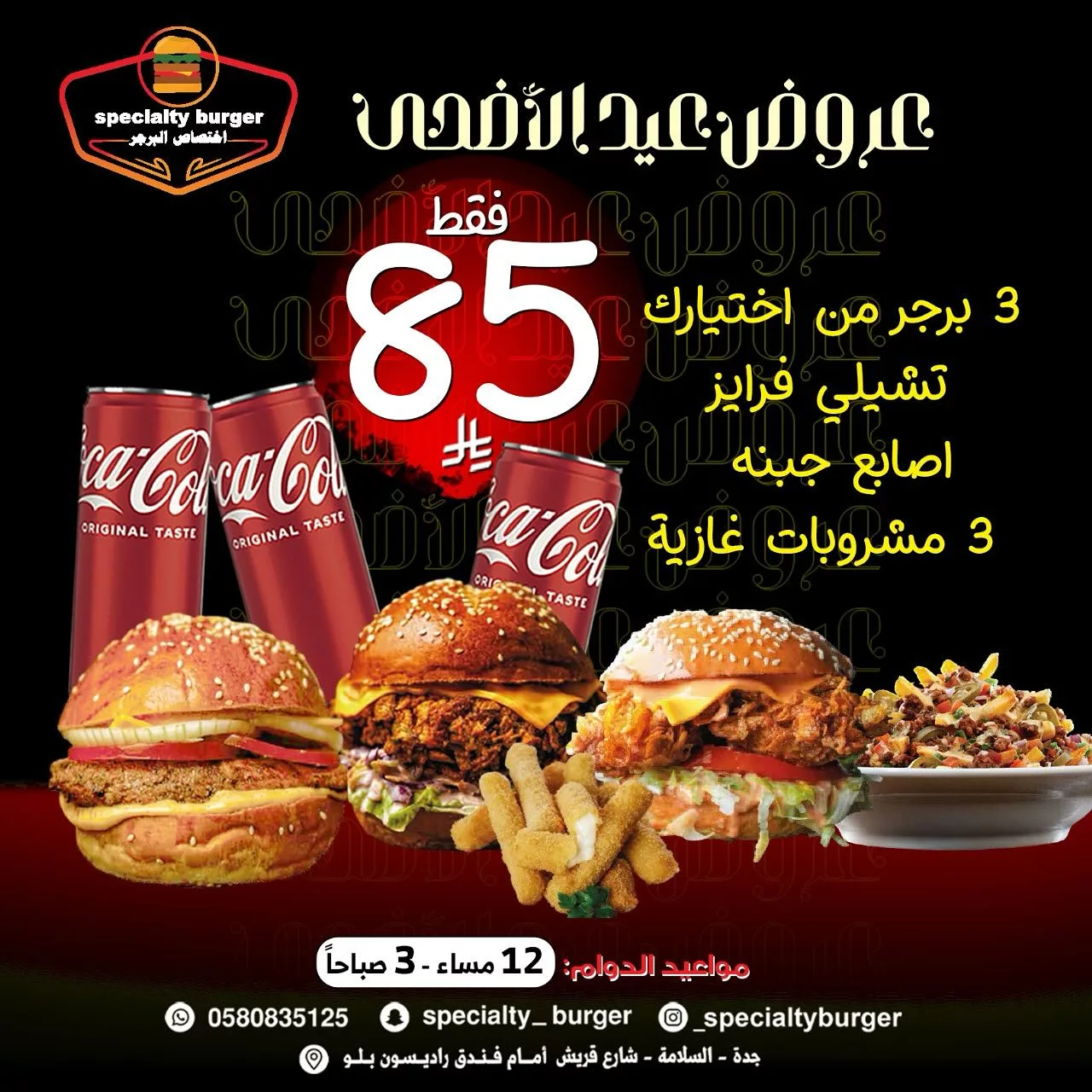 استمتع بوجبة متكاملة ومميزة بمناسبة عيد الأضحى من مطعم سبشيالتي برجر Specialty Burger في جدة مقابل 85 ريال فقط