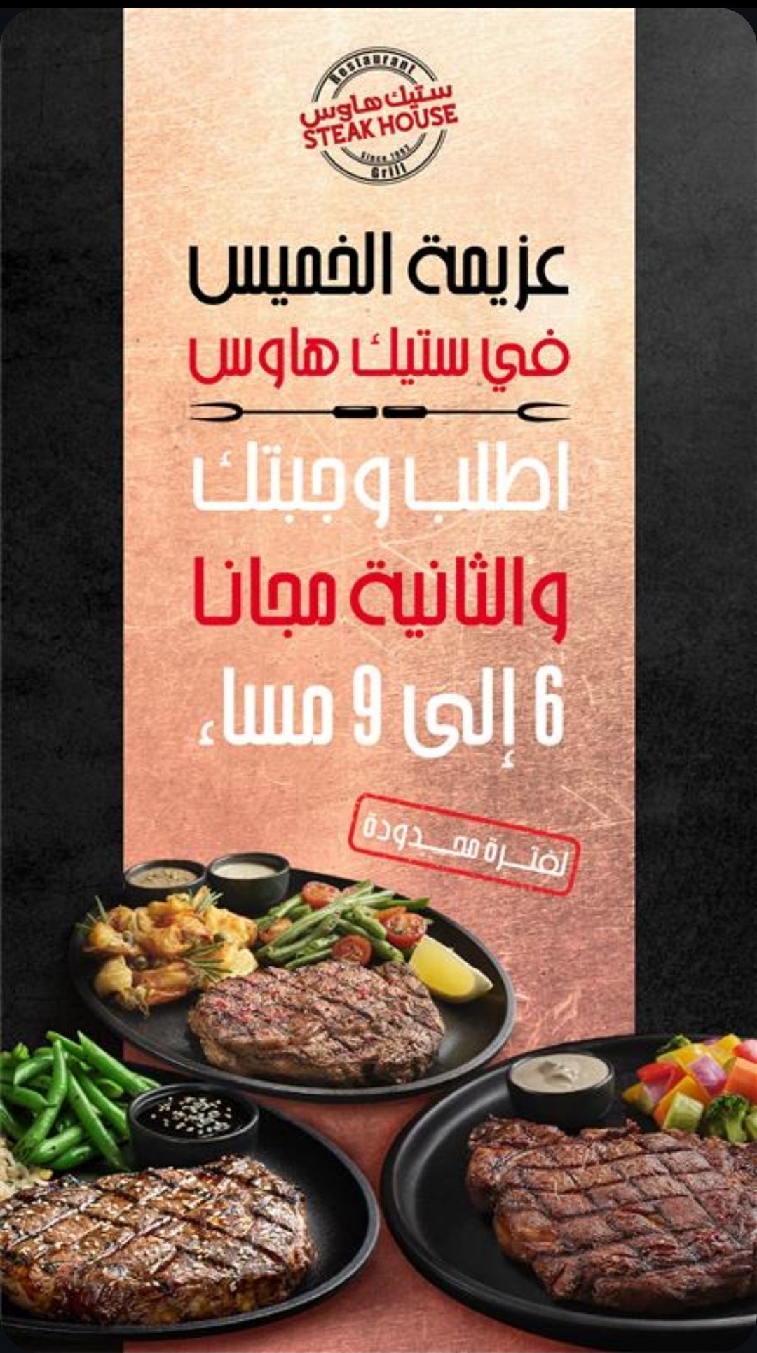 عرض ستيك هاوس المميز تحت عنوان عزيمة الخميس الذي يجمع بين الطعم الفاخر والتجربة المختلفة لعشاق اللحوم والمأكولات الشهية اطلب وجبتك والوجبة الثانية مجاناً العرض متاح من الساعة 6 مساءً حتى 9 مساءً