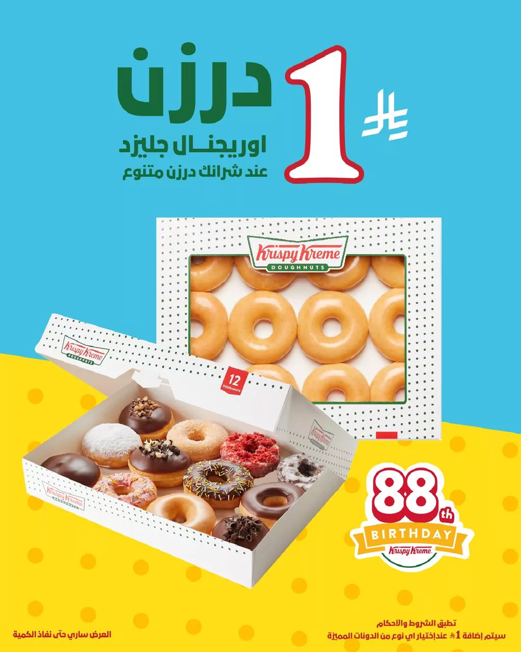 عروض المطاعم في السعودية تشهد تنوعاً رائعاً هذا الصيف، ولا شك أن كرسبي كريم تقدم واحدة من أبرز العروض لعشاق الدونات حيث أعلنت بمناسبة الذكرى الـ88 لتأسيسها عن عرض مميز لا يُفوت لعشاق الحلويات الفاخرة والمذاق الرائع، وهذا العرض متوفر لفترة محدودة فقط ولمدة 3 أيام ابتداءً من تاريخ إطلاق العرض