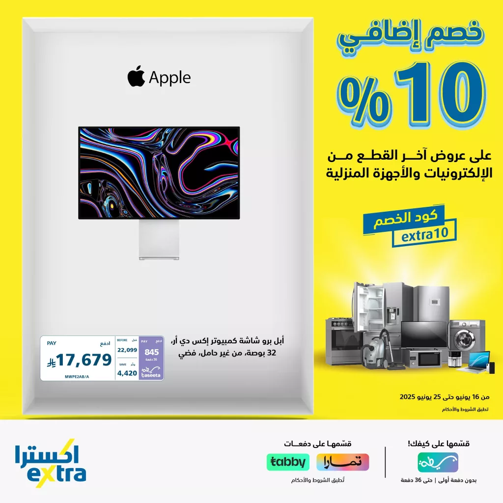 عروض اكسترا السعودية تضم ايضا شاشة أبل برو المخصصة لمحترفي التصميم والمونتاج بجودة عرض استثنائية تجعل التجربة بصرية لا تُنسى كما توفر توشيبا ثلاجة مزدوجة متطورة بمساحة مثالية وتقنيات تبريد موفرة للطاقة إضافة إلى إمكانية الاستفادة من كود خصم extra10